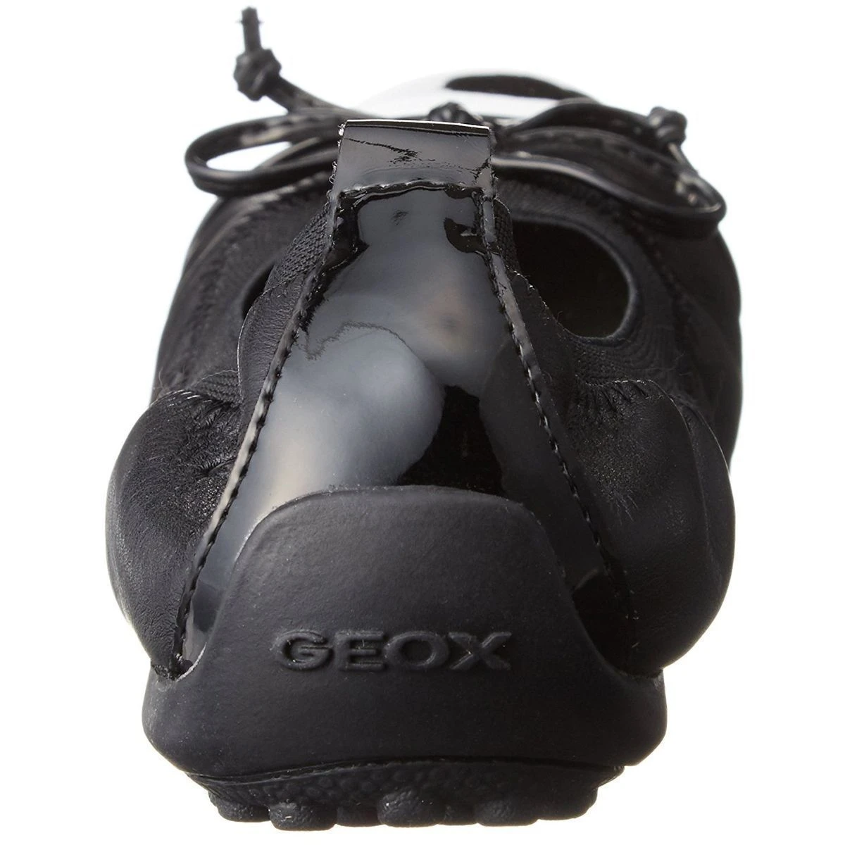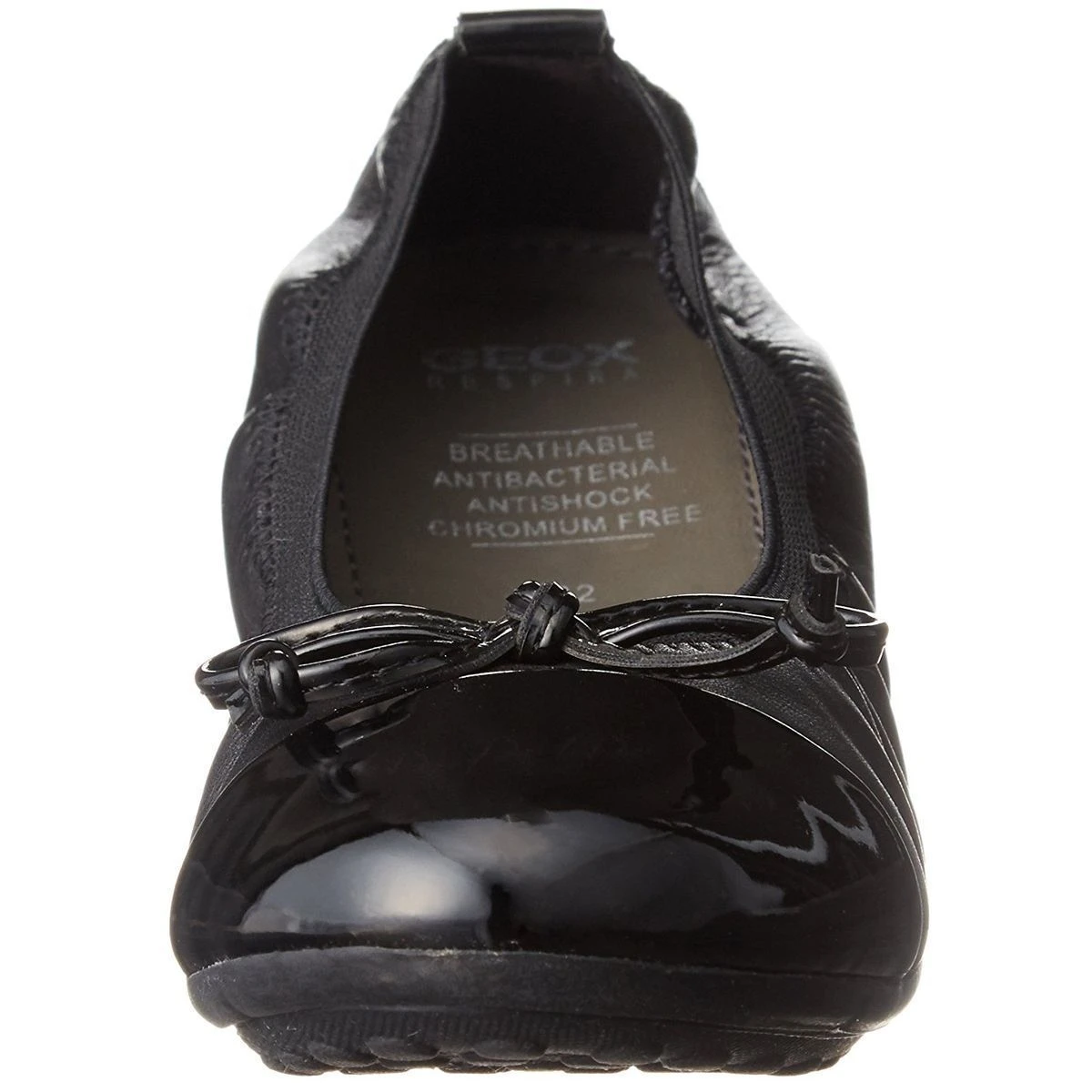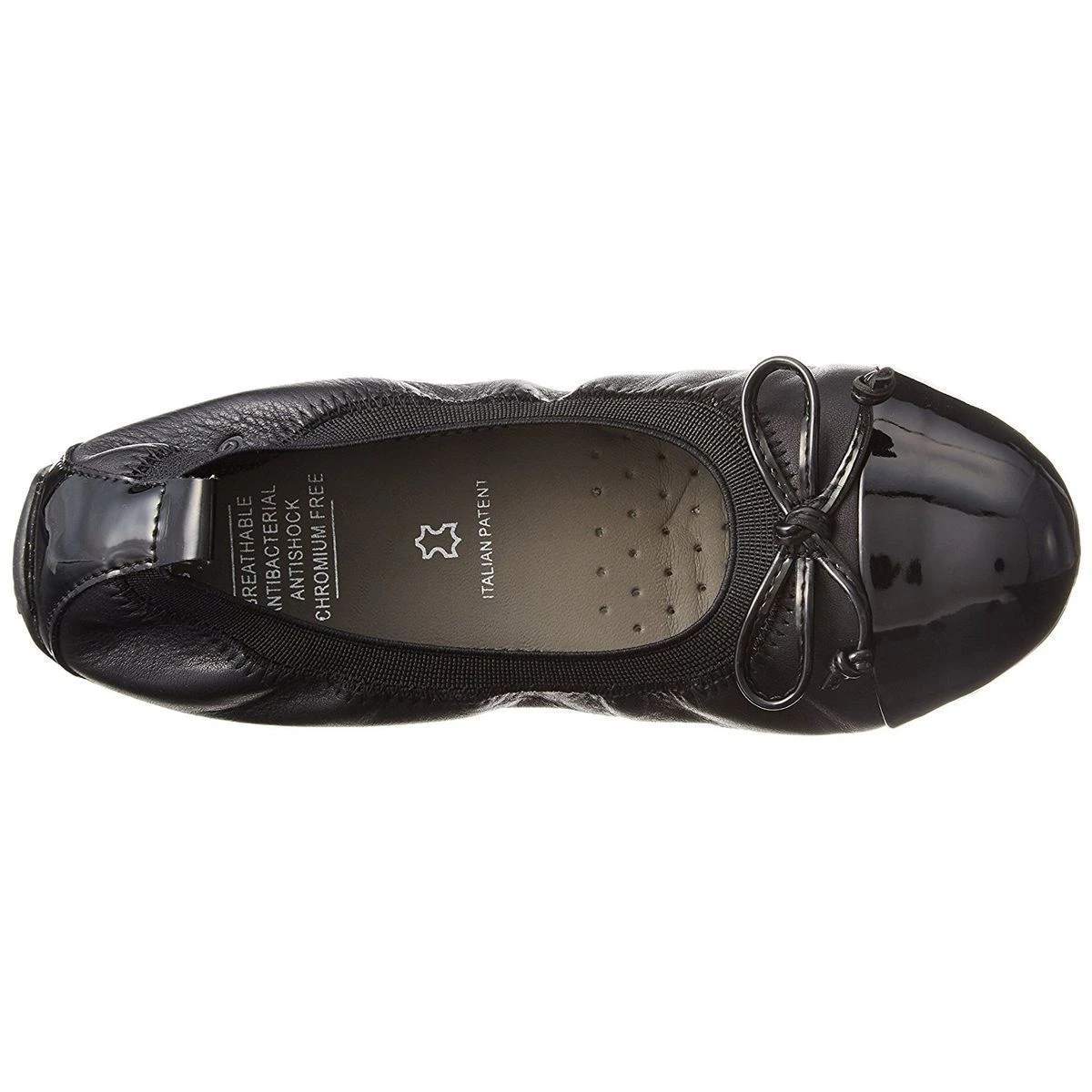 Ballerines pour femme de marque Geox modèle Piuma.Tige en cuir lisse avec bout et contrefort en cuir verni noir. Noeud sur le devant. Contour élastiqué pour plus de confort. Semelle de propreté en cuir. Semelle extérieure souple en gomme. Coloris : noir.7 pièces jointes