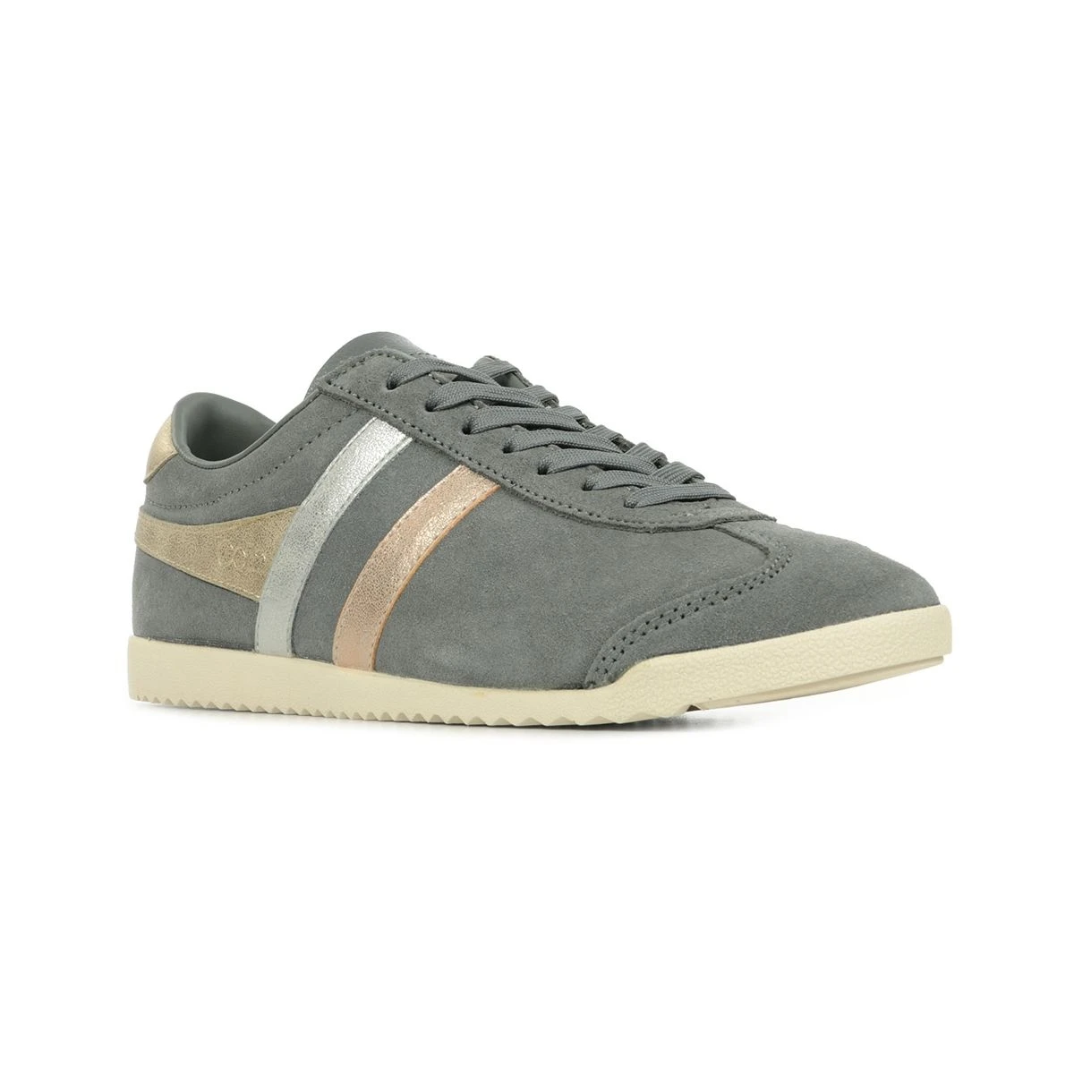 Une touche de fraicheur est apportée aux chaussures Bullet 1976, basket classique de de la marque Gola grâce aux bandes métallisées en or, argent et rose gold.