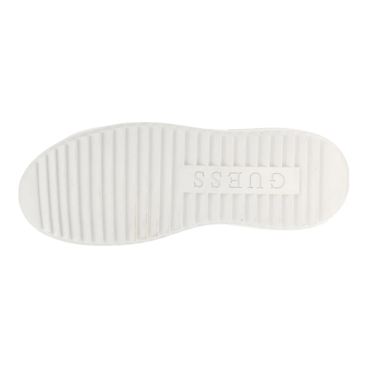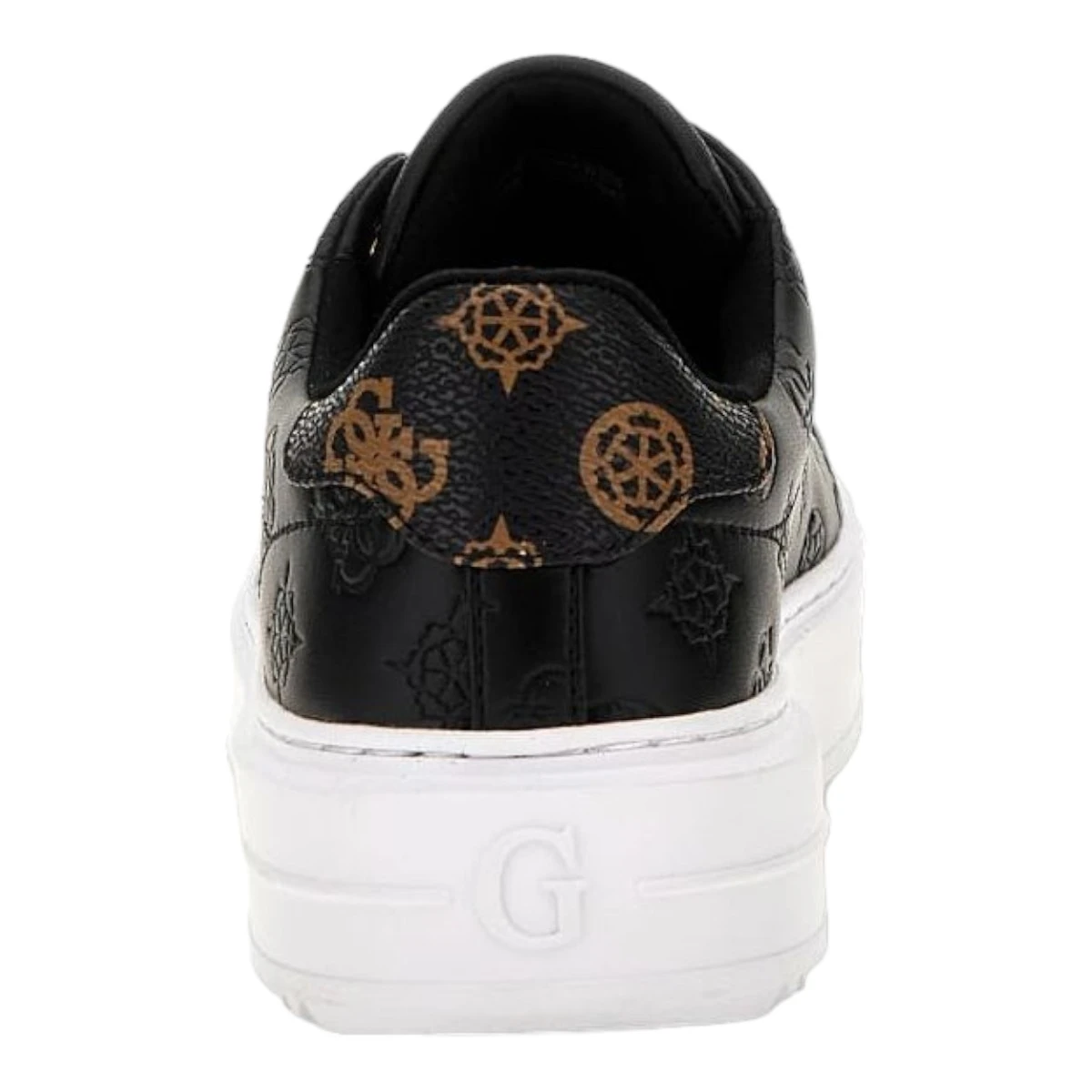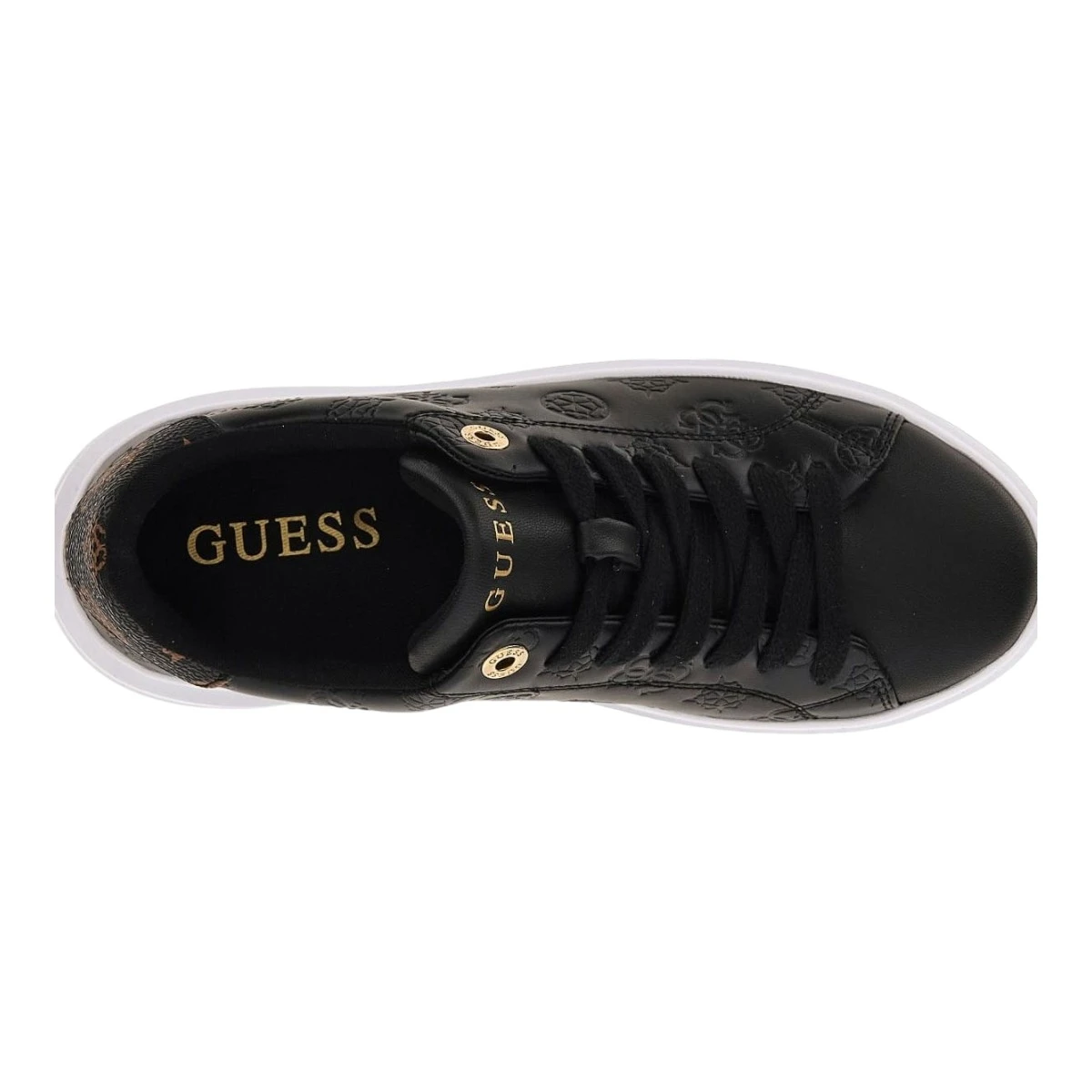 Sneaker Guess femme en simili cuir noir avec logos 4G et pivoines embossés.