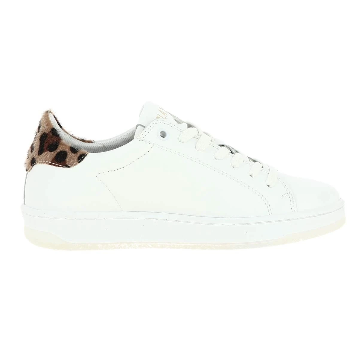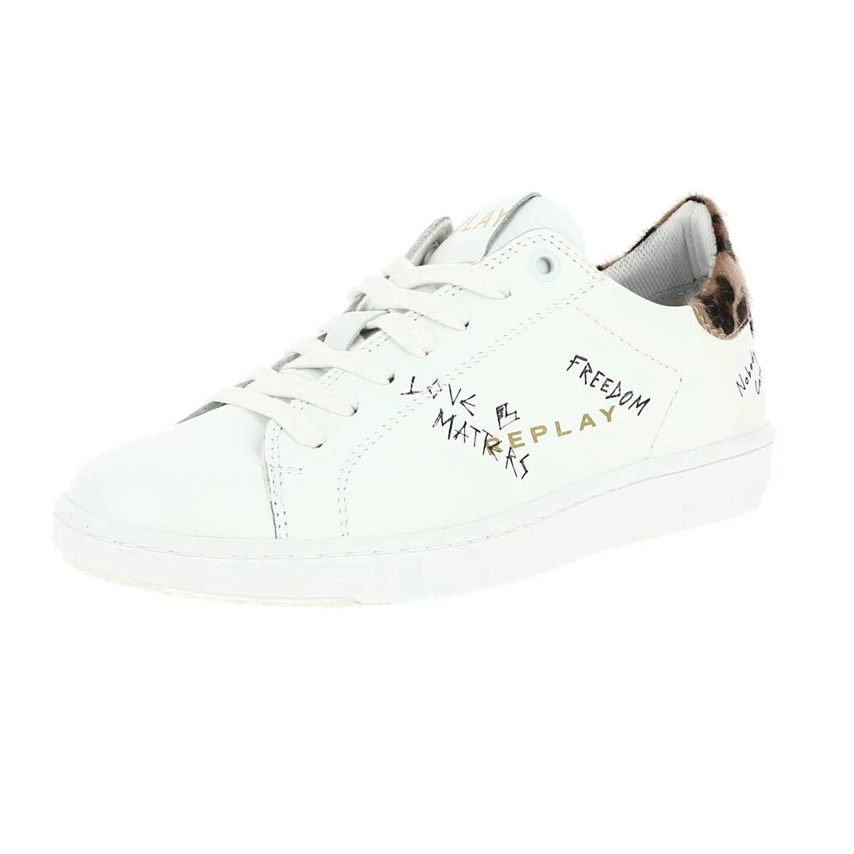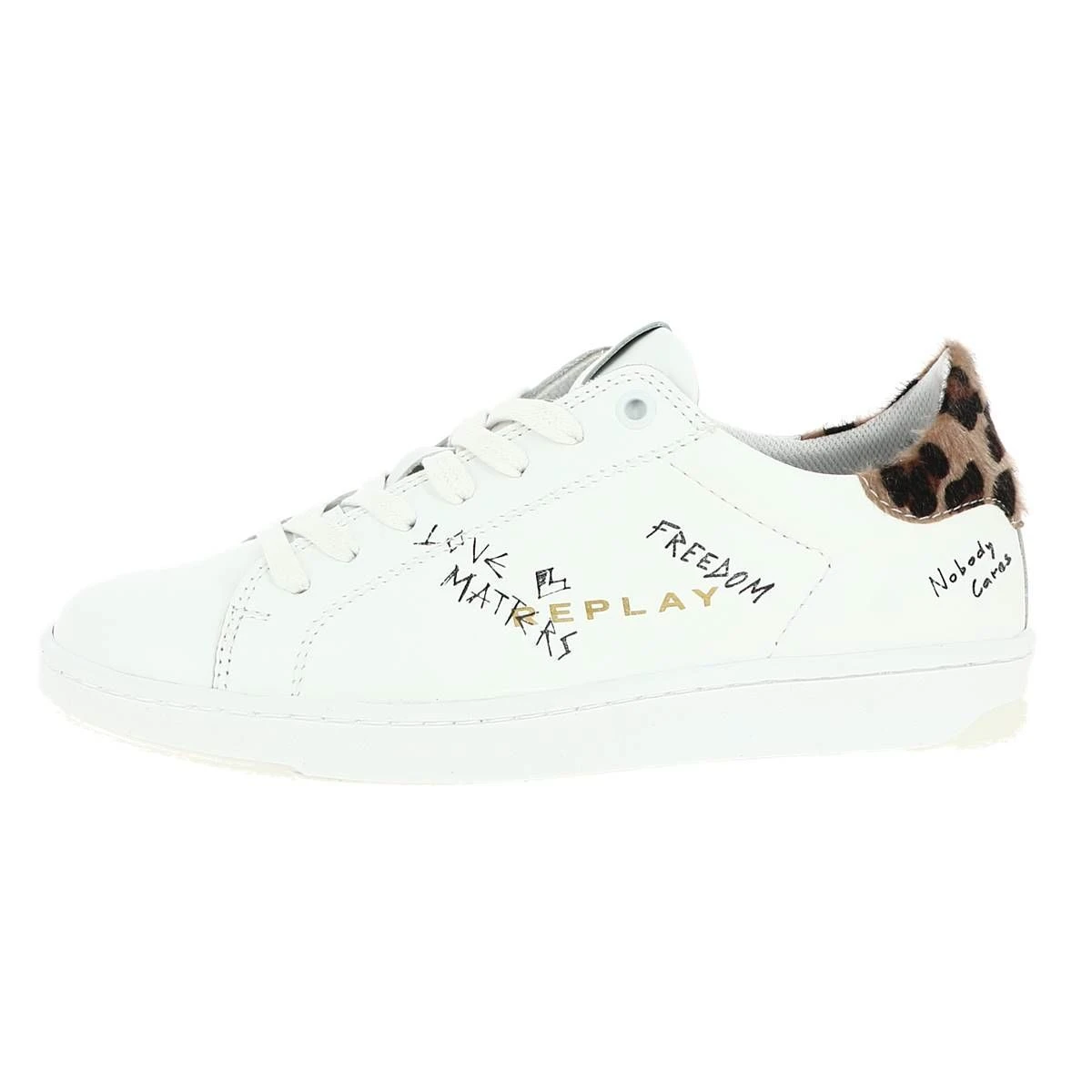 Baskets blanches en cuir pour femme de la marque Replay modèle Gwz20. Bout rond. Lacets plats. Empiècements léopard au talon.Languette rembourrée. Hauteur de semelle : 3 cm. Tige en cuir blanc. Doublure cuir et textile.Inscription façon » tag » sur le côté extérieur. Semelle en gomme antidérapante qui promet résistance, légèreté et confort total. Coloris : blanc.
