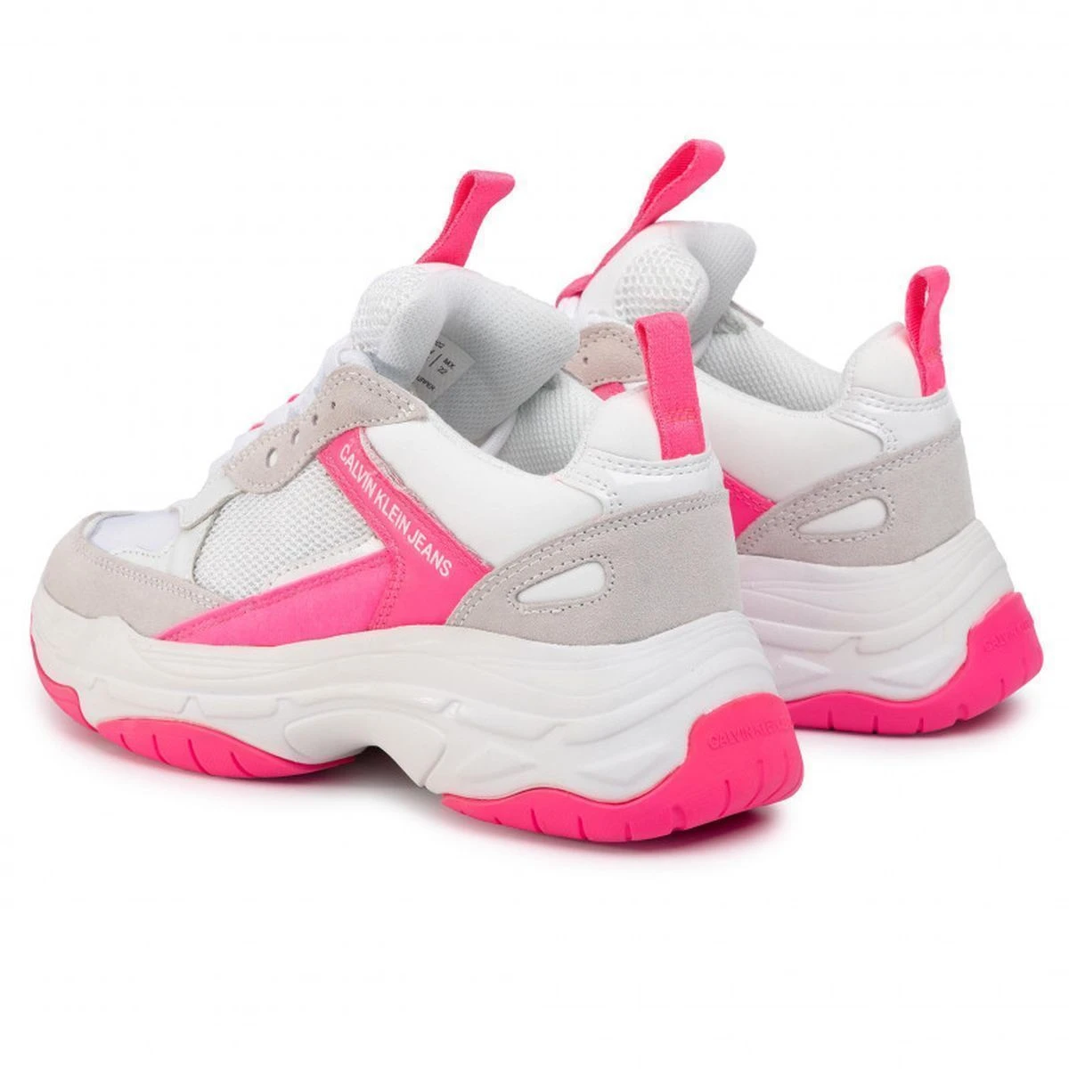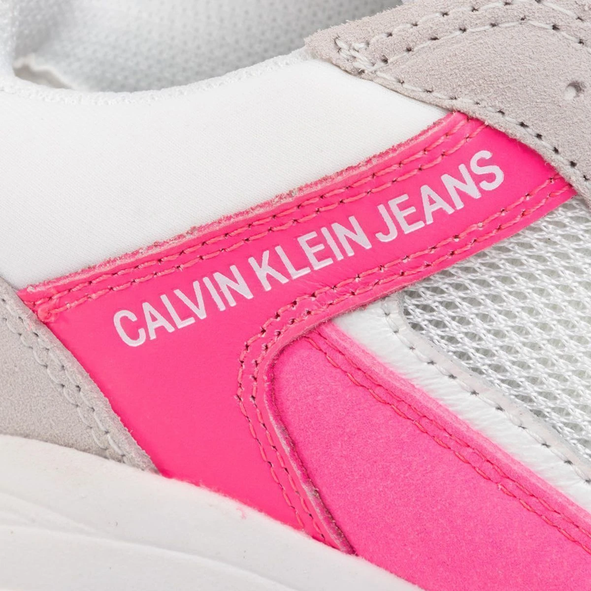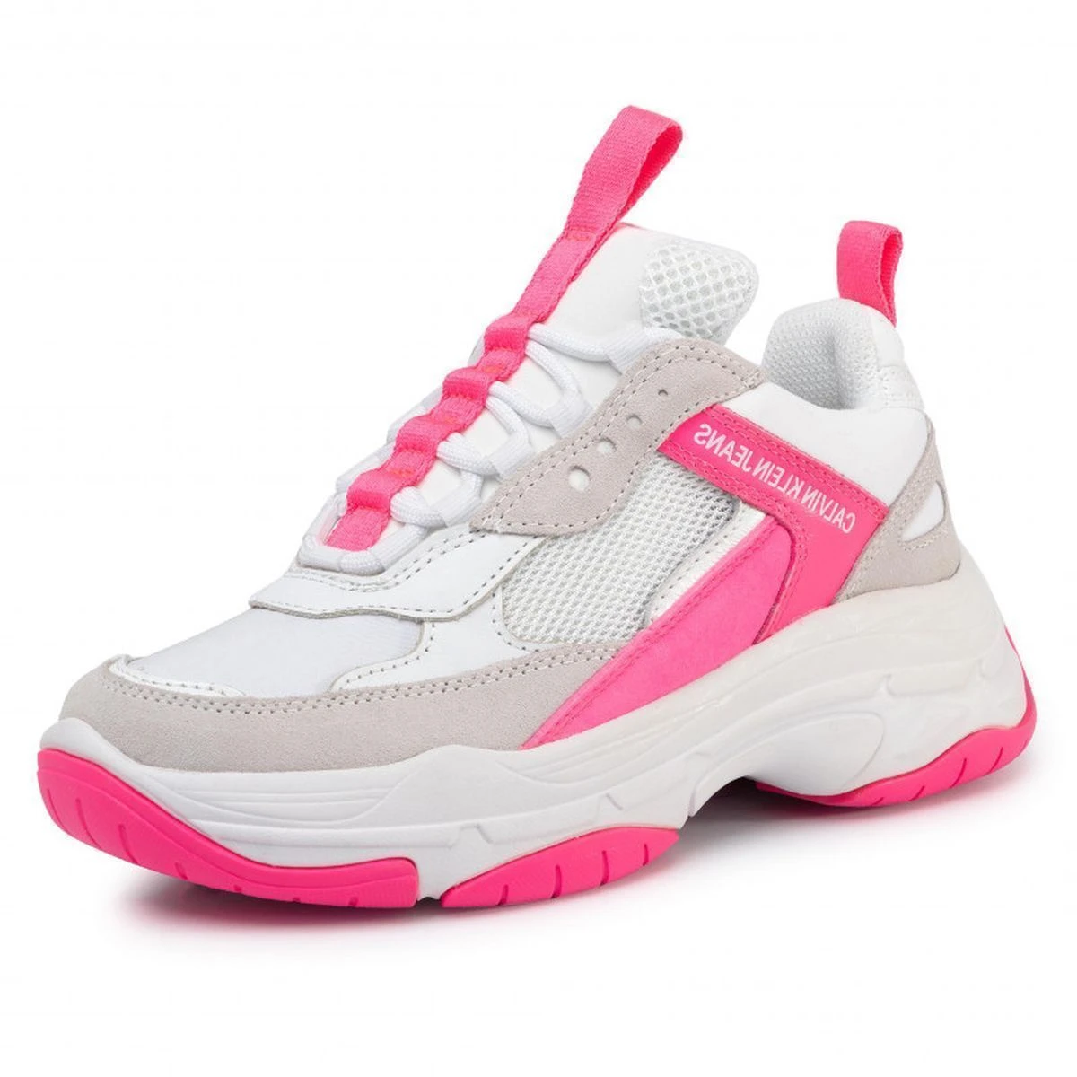 Baskets Calvin Klein modèle Maya blanc/ rose flup.Tige en textile et cuir. Semelle de propreté en polyester. Semelle extérieure en caoutchouc et EVA.Logo Calvin Klein sur le côté et au talon. Hauteur de talon : 5 cm. Coloris : blanc/pink fluo .