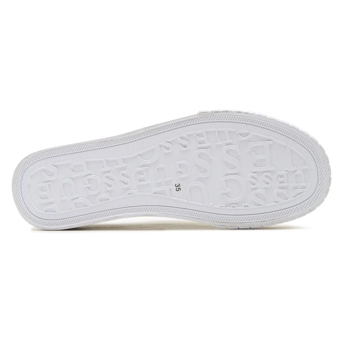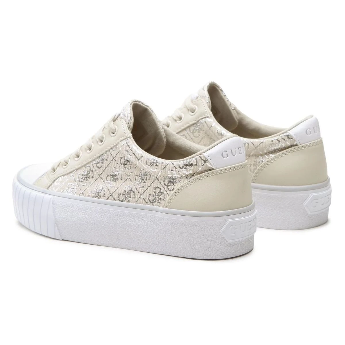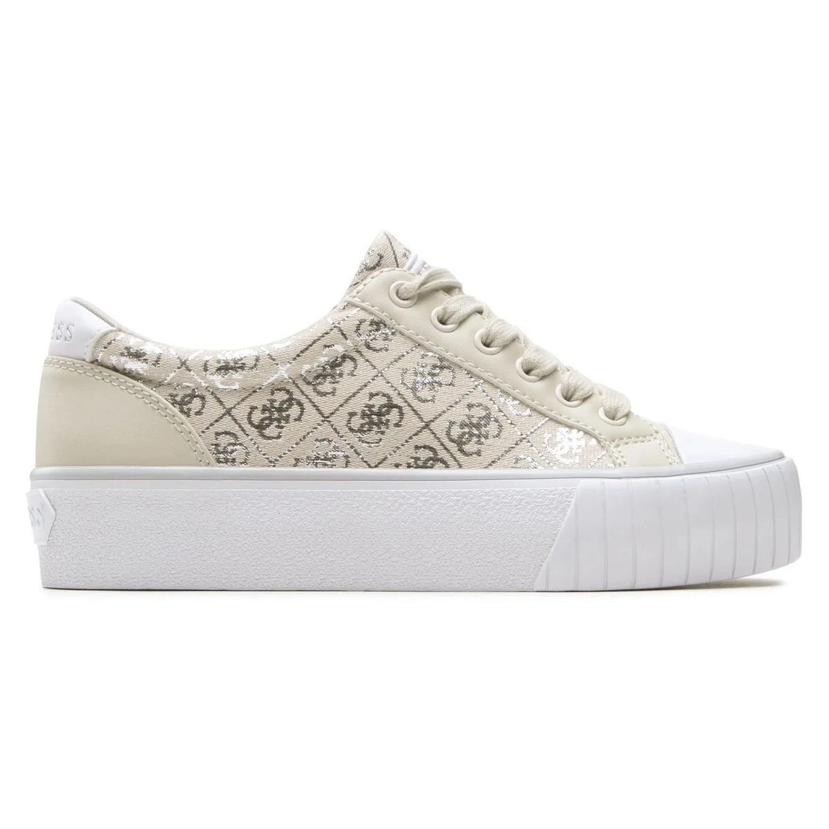 Cette sneakers Guess se décline en simili cuir beige et toile beige imprimée logo 4G argenté.