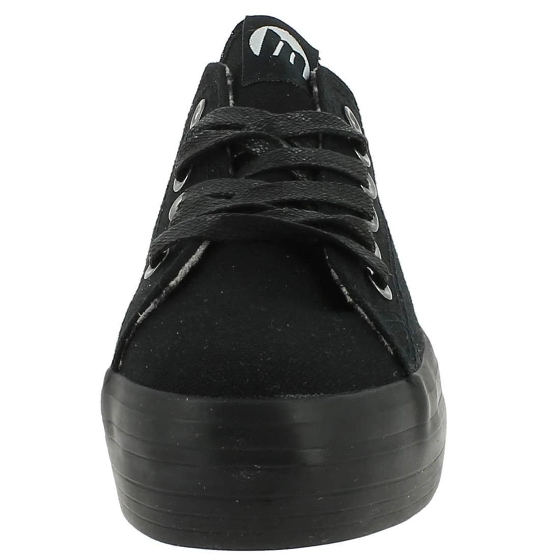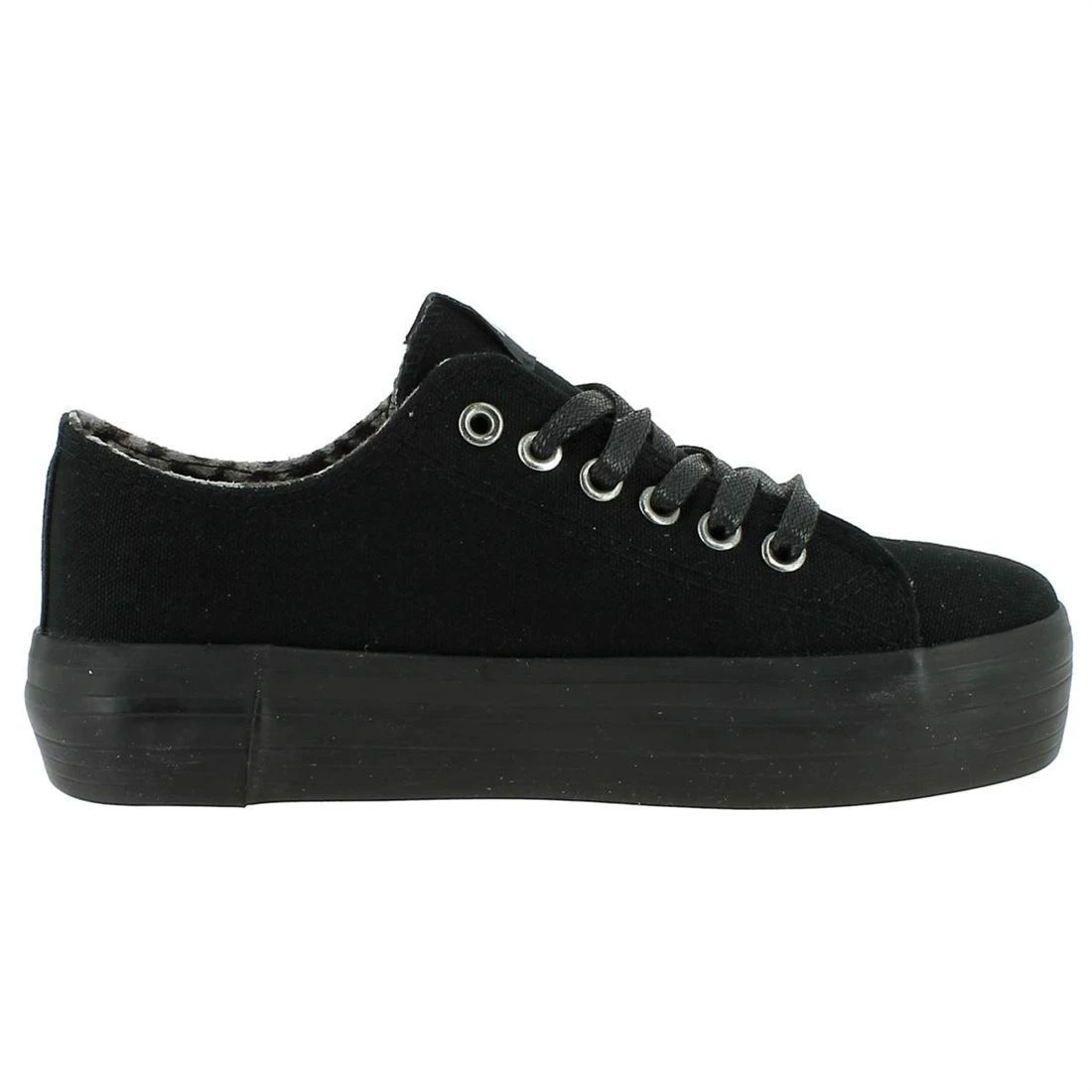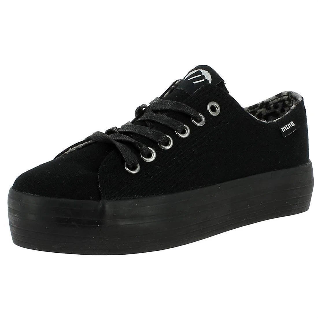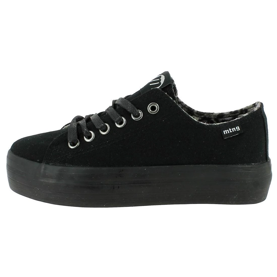 Baskets à plateau pour femme de la marque MTNG.Dessus toile noirel, doublure toile imprimé léopard, semelle bien isolante en gomme.Fermeture à lacets. Parfaites pour terminer un look décontracté !