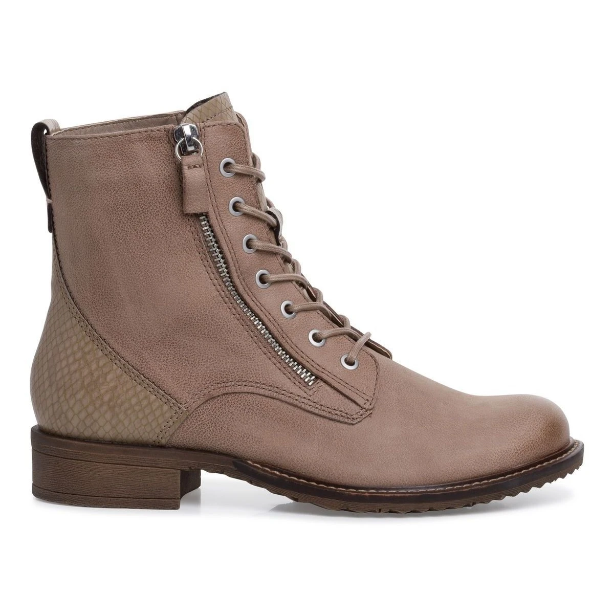 Contemporaines, cesbottines décontractées d’inspiration citadine, sont présentées en cuir avec des empiècements en simili cuir façon serpent ton sur ton.