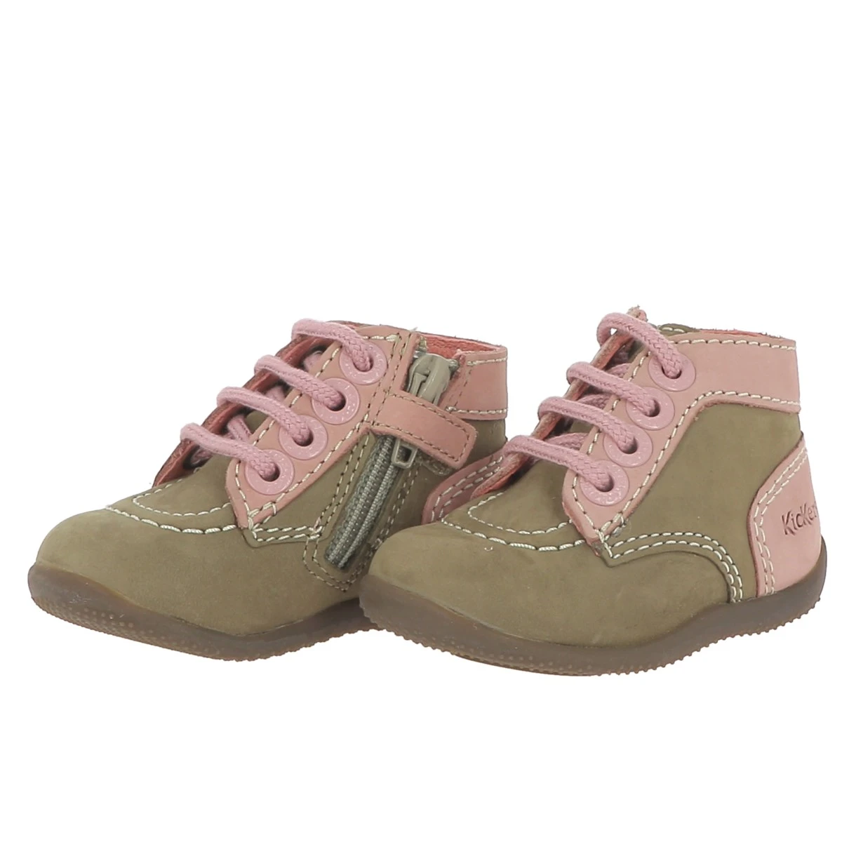 Bottines bébé de la marque Kickers modèle Bonzip en cuir nubuck bicolore. Fermeture par zip sur le côté avec petit scratch de maintien . Voûte plantaire pour un meilleur maintien du pied. Doublure et semelle de propreté en cuir. Semelle souple résistante et antidérapante en gomme .
