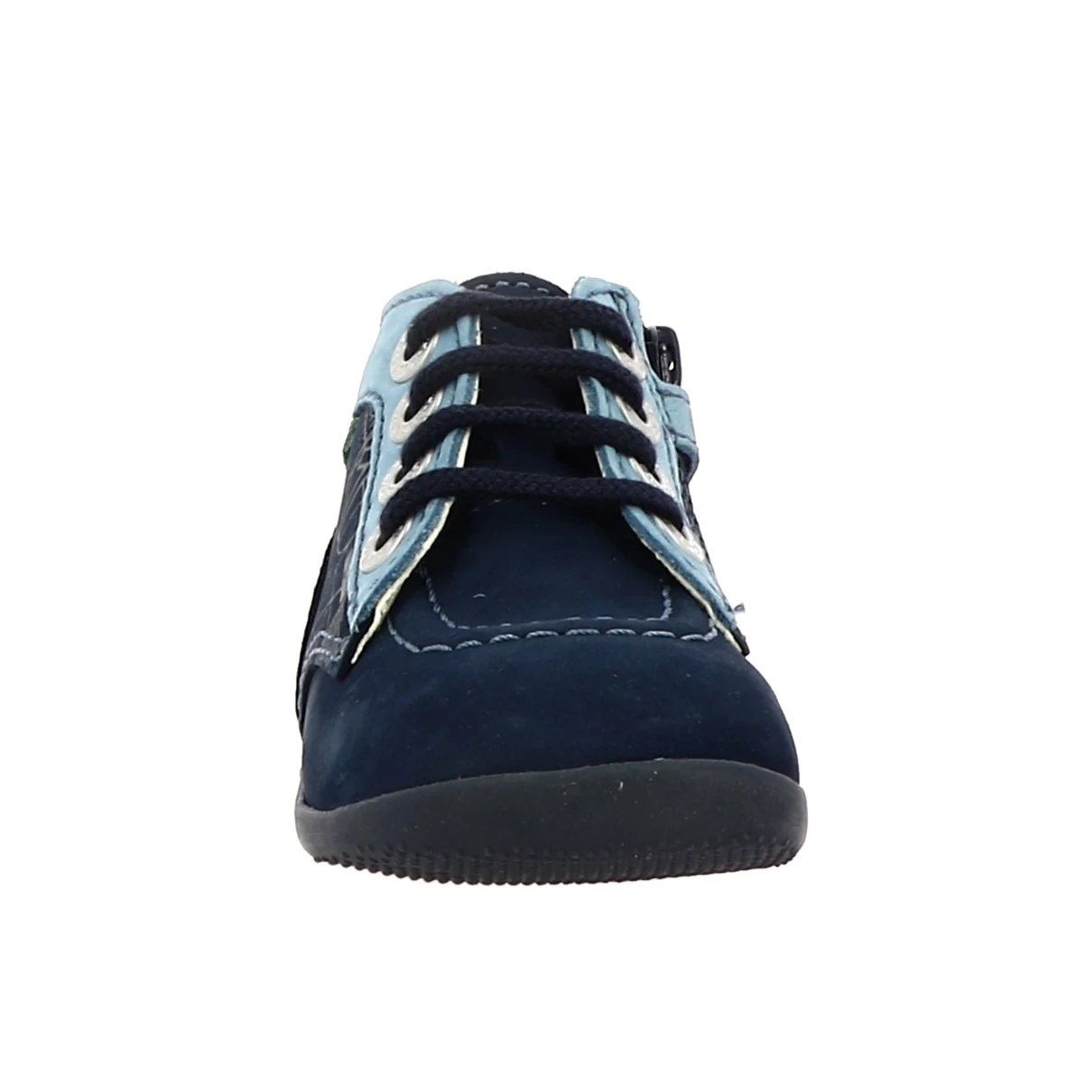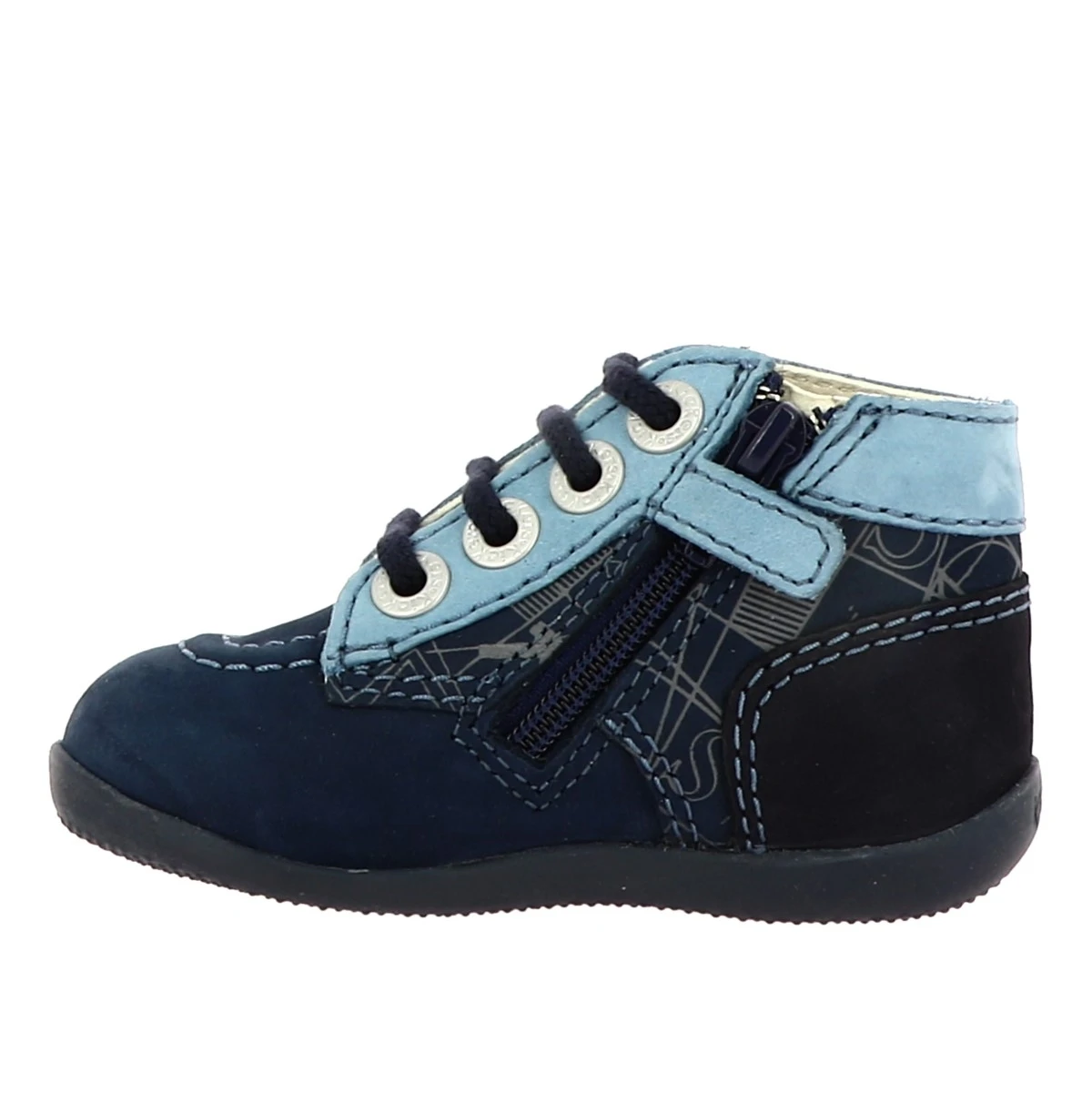 Bottines bébé de la marque Kickers modèle Bonzip en cuir nubuck tricolore. Fermeture par zip sur le côté avec petit scratch de maintien. Voûte plantaire pour un meilleur maintien du pied. Doublure et semelle de propreté en cuir. Semelle souple résistante et antidérapante en gomme.