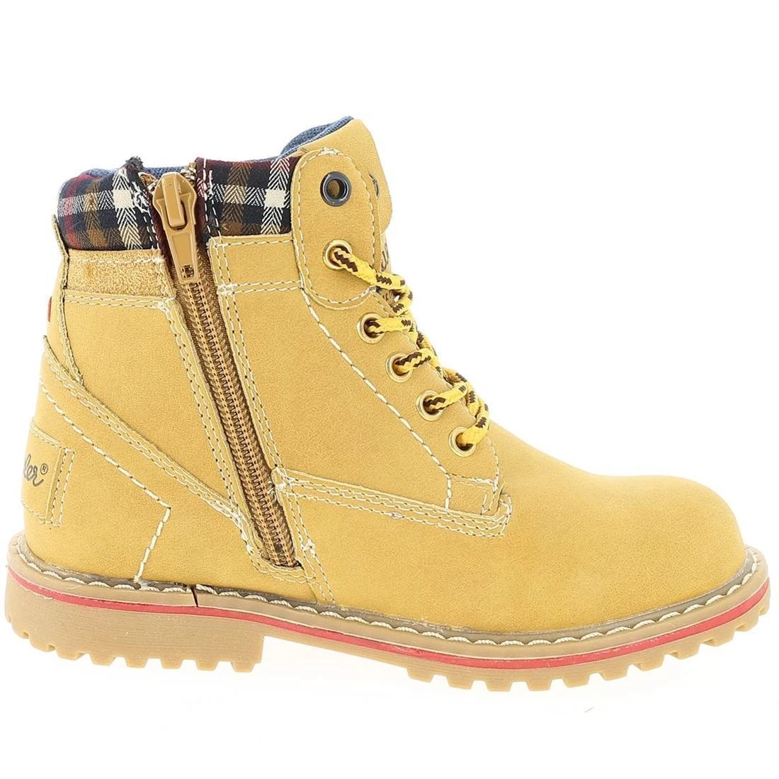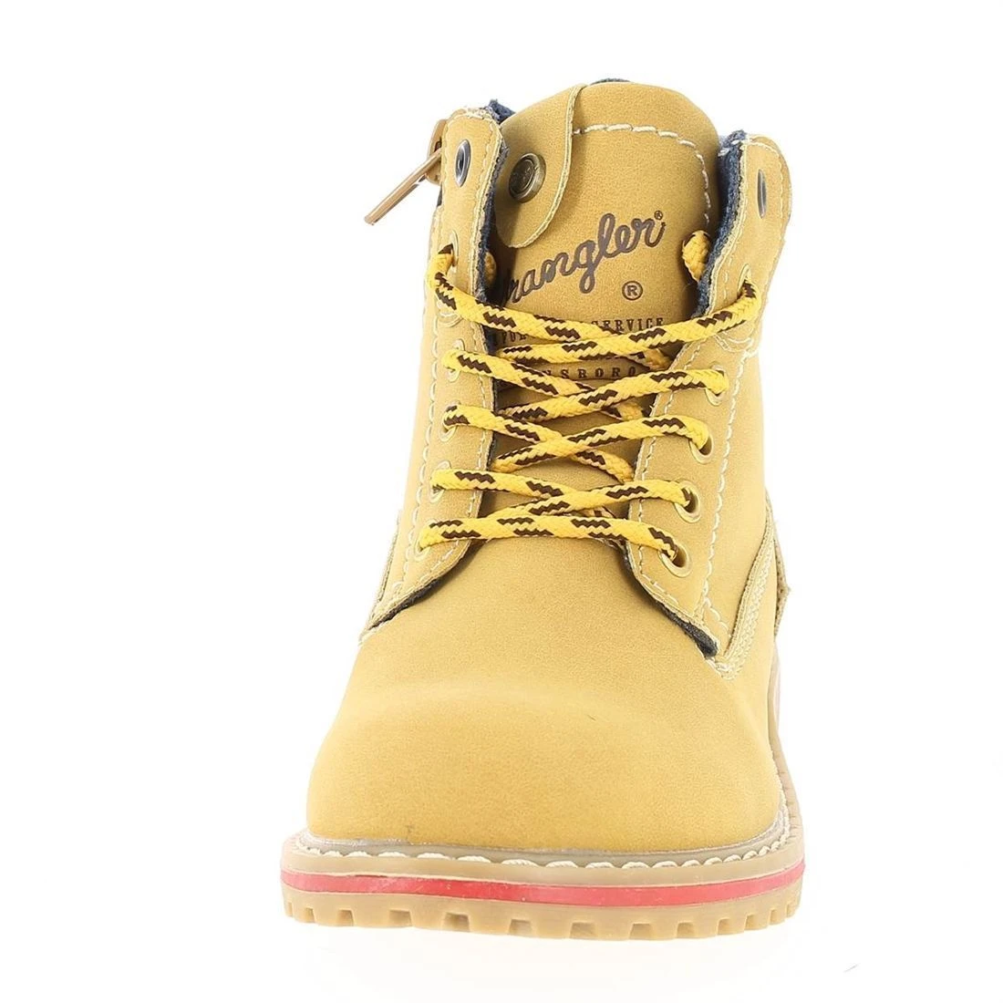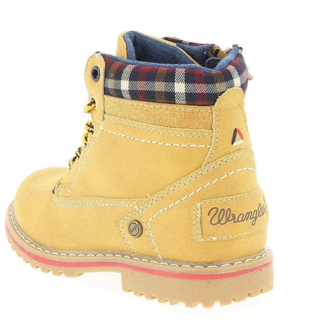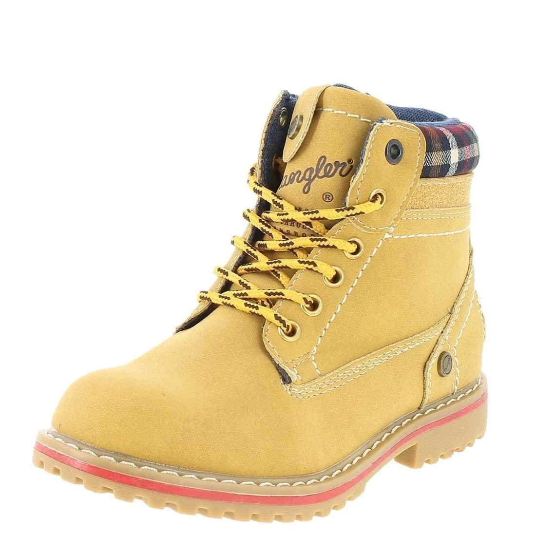 Bottines garçon de marque Wrangler modèle Creek.Confortables et bien conçues, ces bottines offrent un réel confort grâce à la semelle intérieure anatomique à mémoire de forme et le contour matelassé.Elles se ferment par zip et s’ajustent grâce aux lacets.L intérieur est doublé mesh. Dessus simili cuir.Cette bottine qui sied à nos petits baroudeurs urbains s’associeront aussi bien avec un jean ou un pantalon cargo. Lacets bicolores. Coloris : tan yellow .