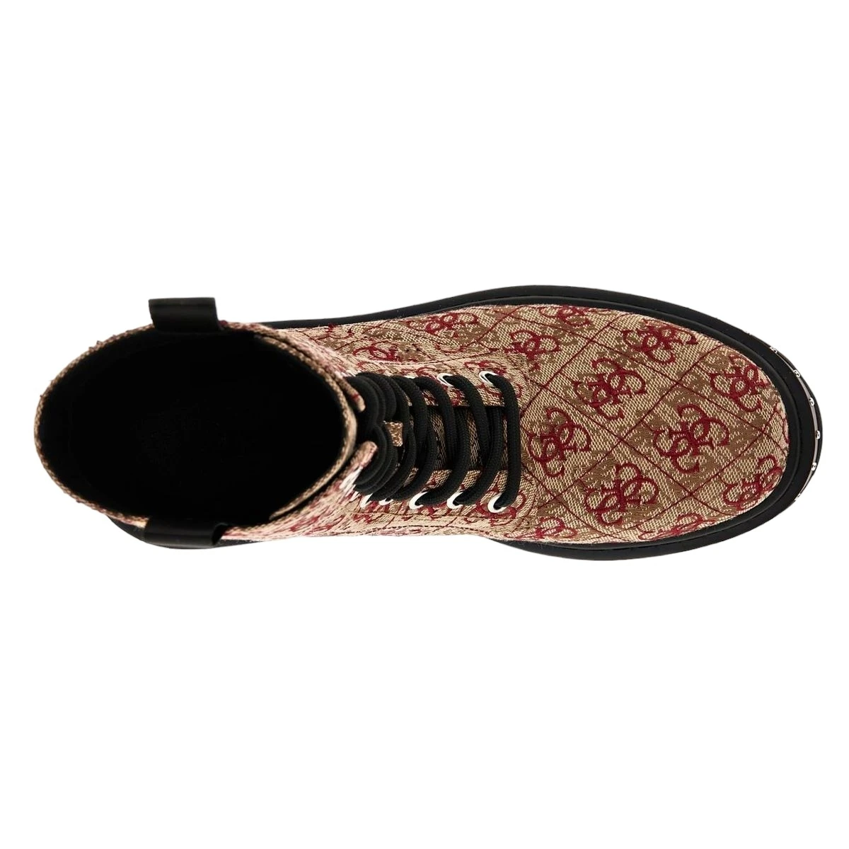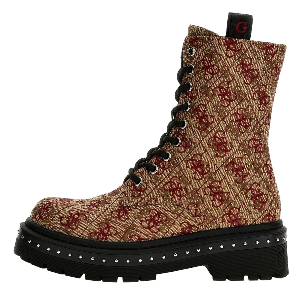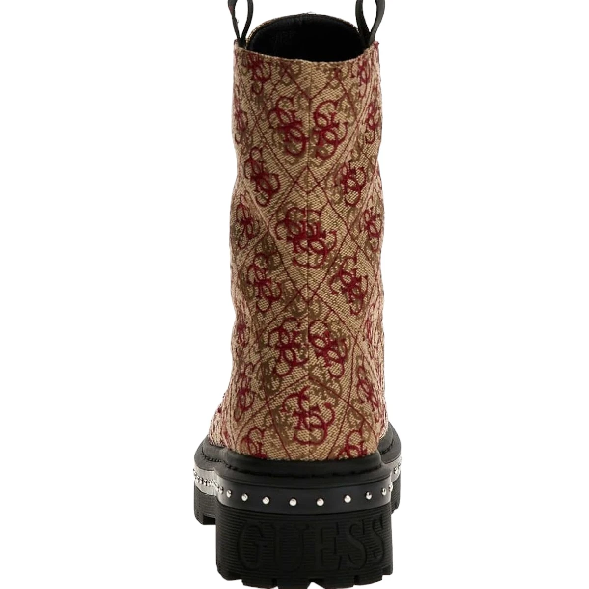 Ces bottines femme sont fabriquĂ©es en toile rĂ©sistante brodĂ©e de logos Guess 4G contrastants et disposent d’une semelle Ă©paisse et rĂ©sistante.