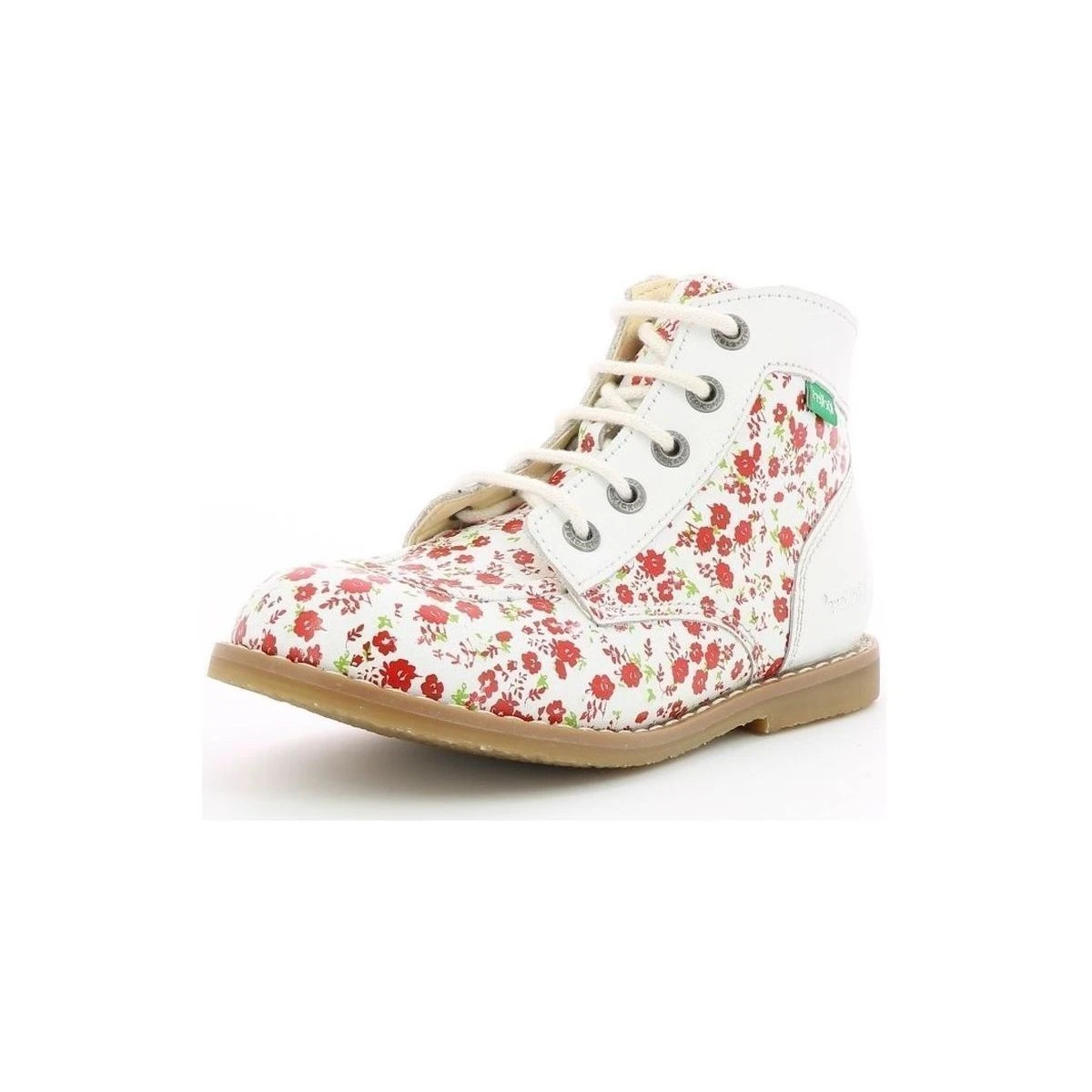 Bottines femme de la marque Kickers en cuir modèle Kouklegend coloris blanc fleuri. Fermeture à Zip très pratique.