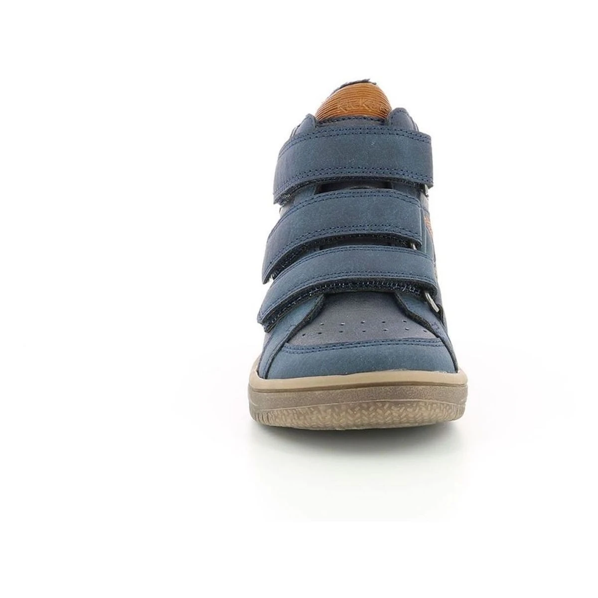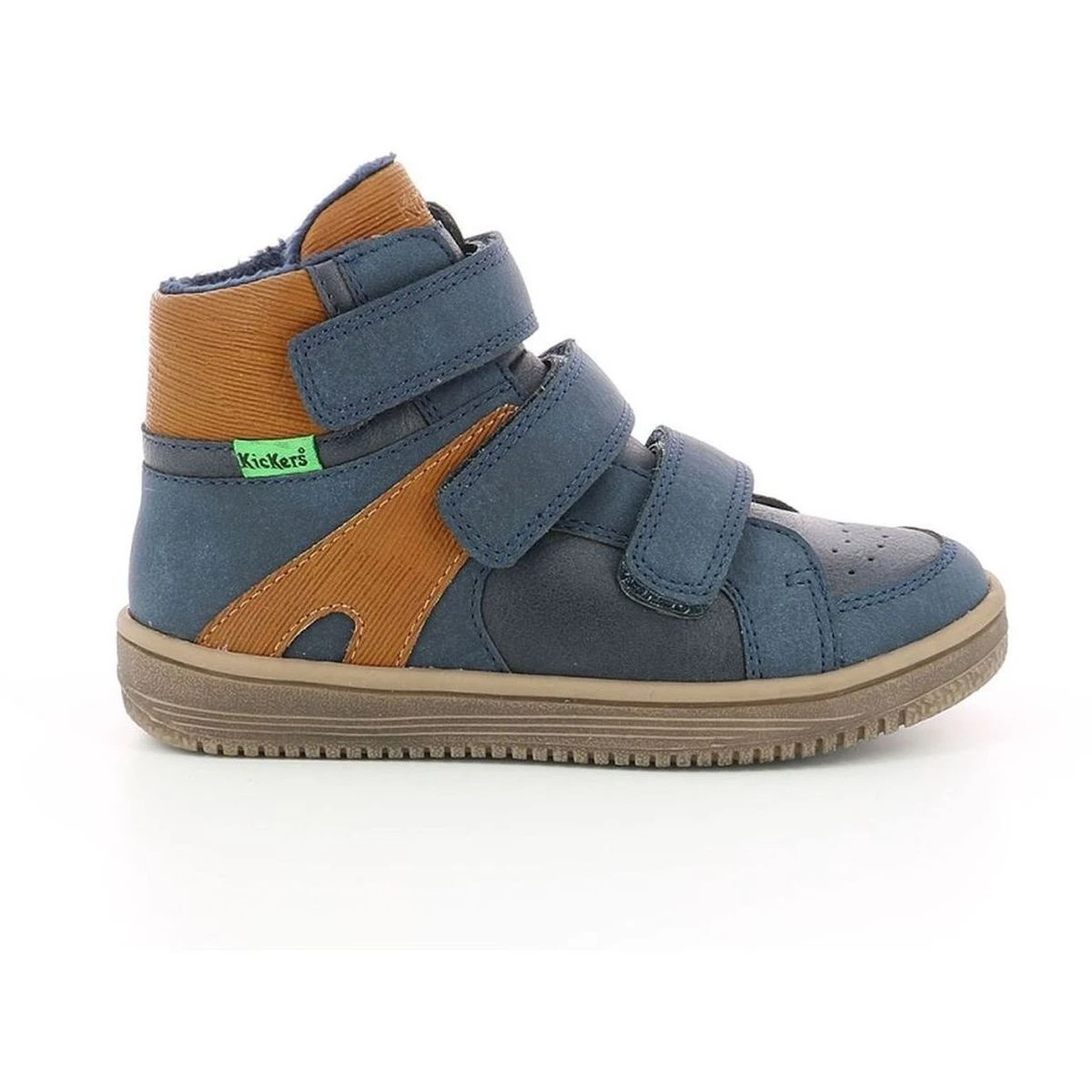 Chaussures montantes à scratch pour enfant de la marque Kickers modèle Lohan.Tige en simili cuir. Duoblure chaude en textile. Semelle de propreté en cuir .Coloris : marine kaki .