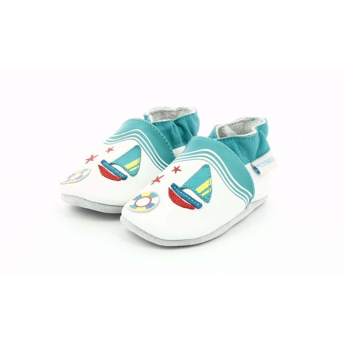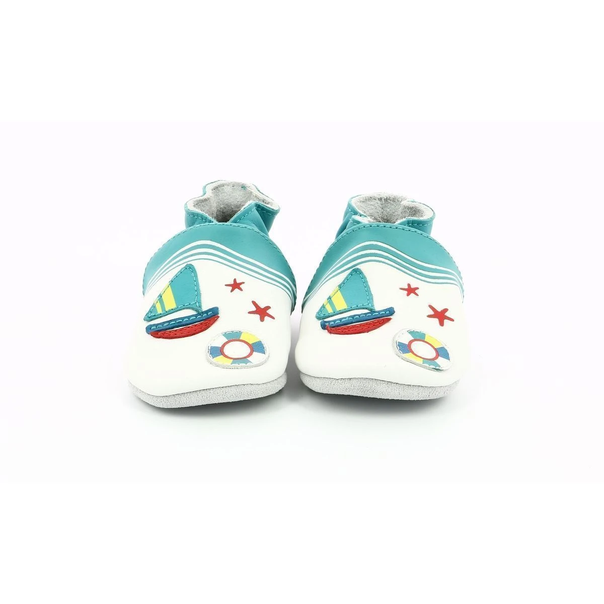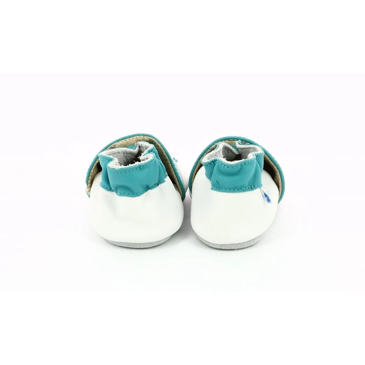 Chaussons enfant de la marque Robeez modèle Lifeguard coloris blanc turquoiseLes chaussons parfaits pour tous les jours qui restent toujours en place et enveloppent tendrement les petits pieds.- Semelle antidérapante en suède pour une utilisation en intérieur- Matériaux souples épousant chaque pas- Cuir français à tannage végétal.Chaussons de la naissance jusqu’à 6 ans.Bande cheville maintenant le chausson bien en place.Parfaits pour le pied du pied grâce à la semelle douce et légère.
