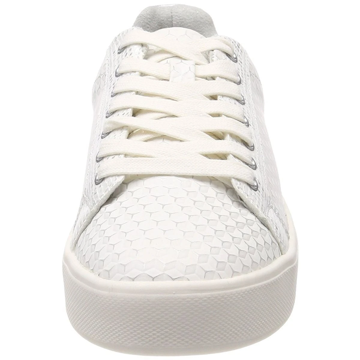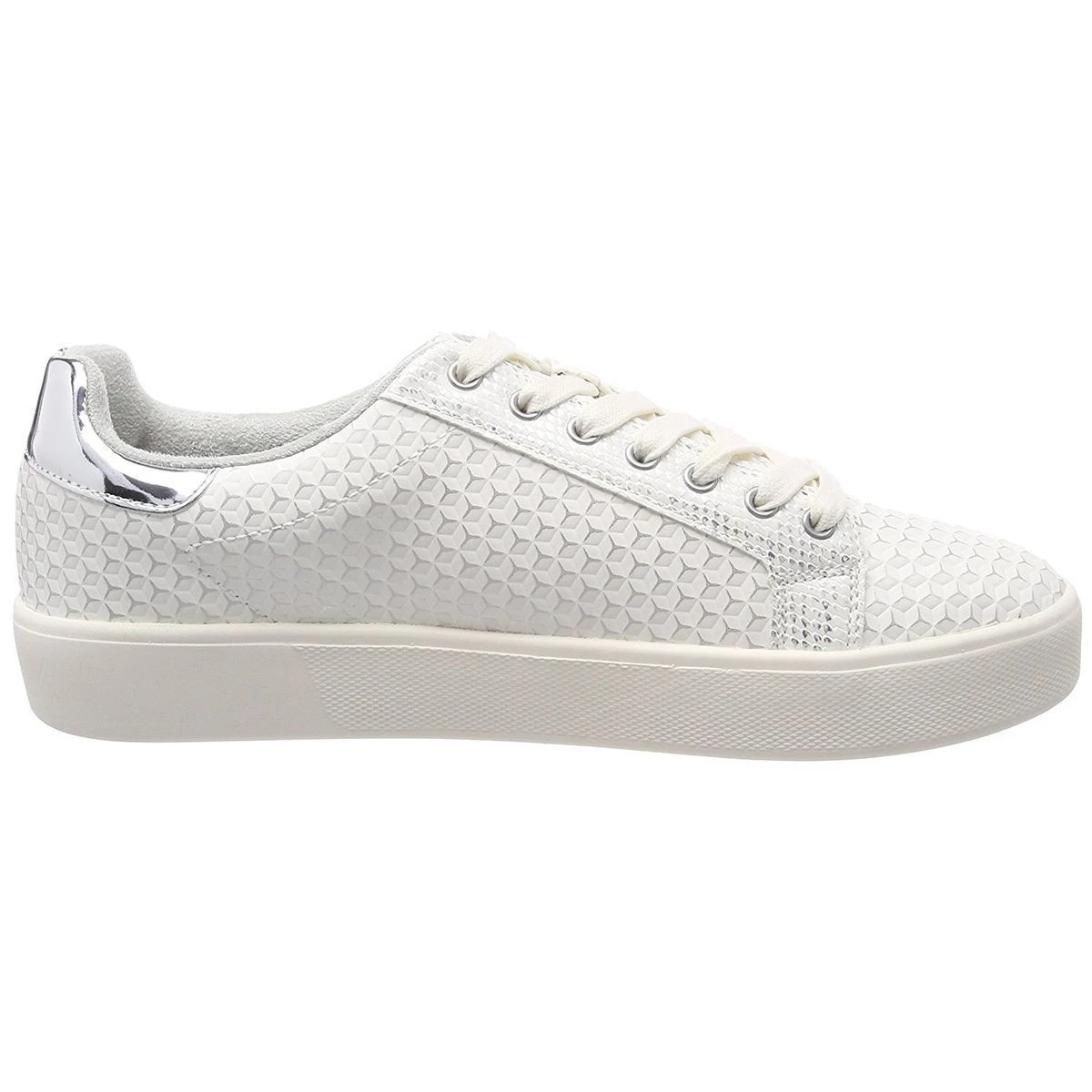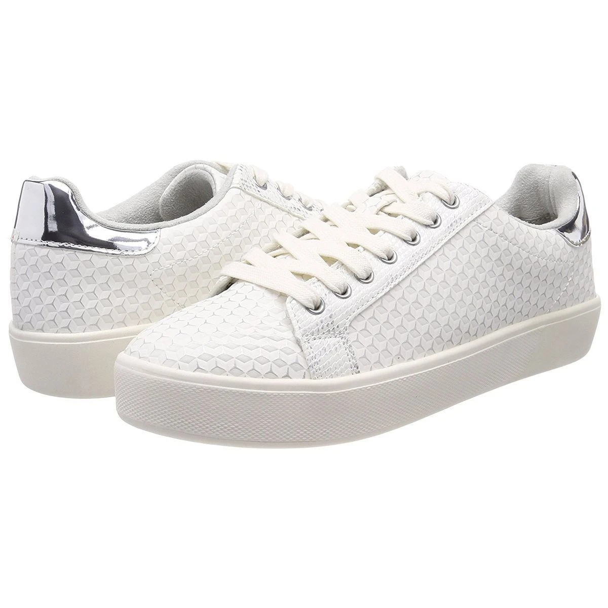 Sneakers Tamaris pour femme modèle 23724 en simili cuir blanc. Contrefort argenté. Fermeture à lacets.Tige ornée de motifs hexaèdres géométriques. Doublure textile.Semelle épaisse de 3 cm. Casual et confortable pour la ville et au quotidien avec la semelle Touch it a memoire de forme.Coloris : blanc .