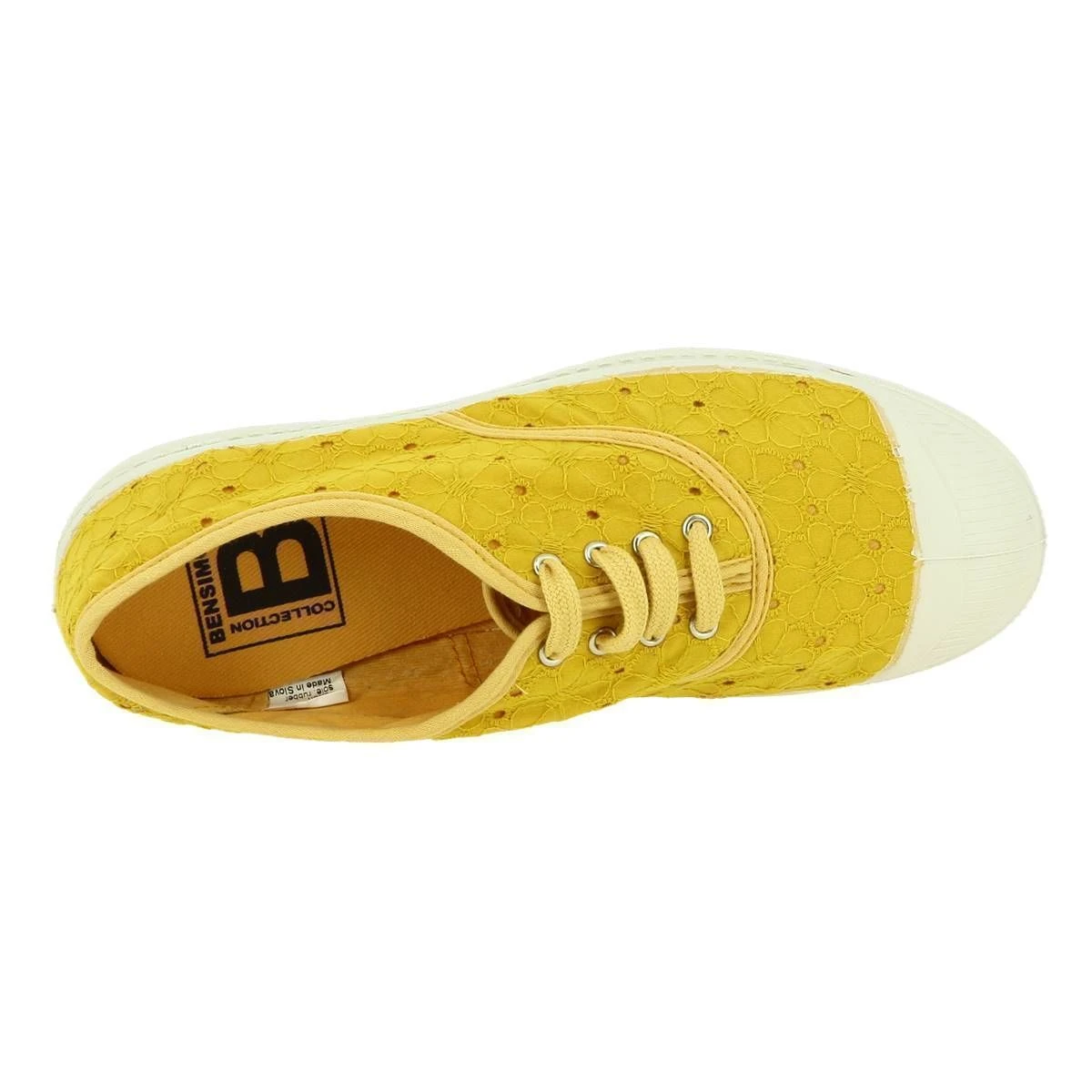 Tennis broderies anglaises pour femme de la marque Bensimon.Lacets plats, œilletsmétallisés.Composition:broderie100%coton,doublure100%coton,semelleencaoutchouc.Unesérielimitéepourunlookromantiqueassurée!Coloris:jaunesafran .