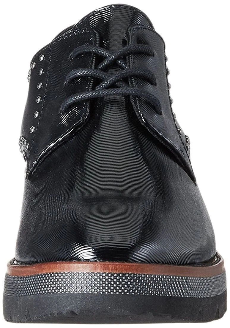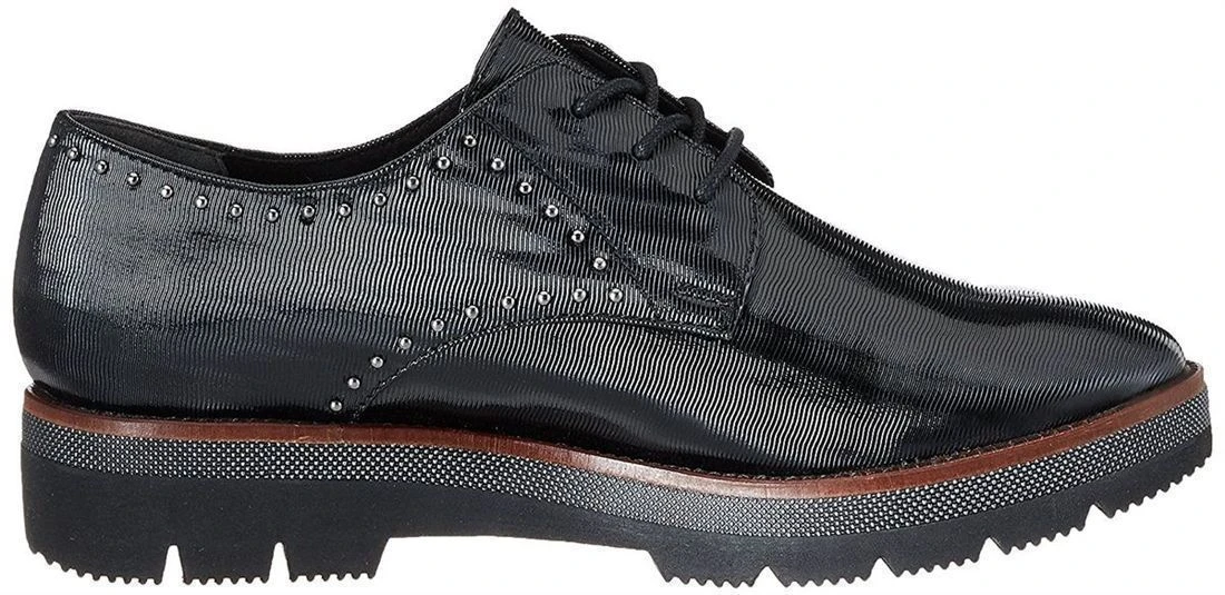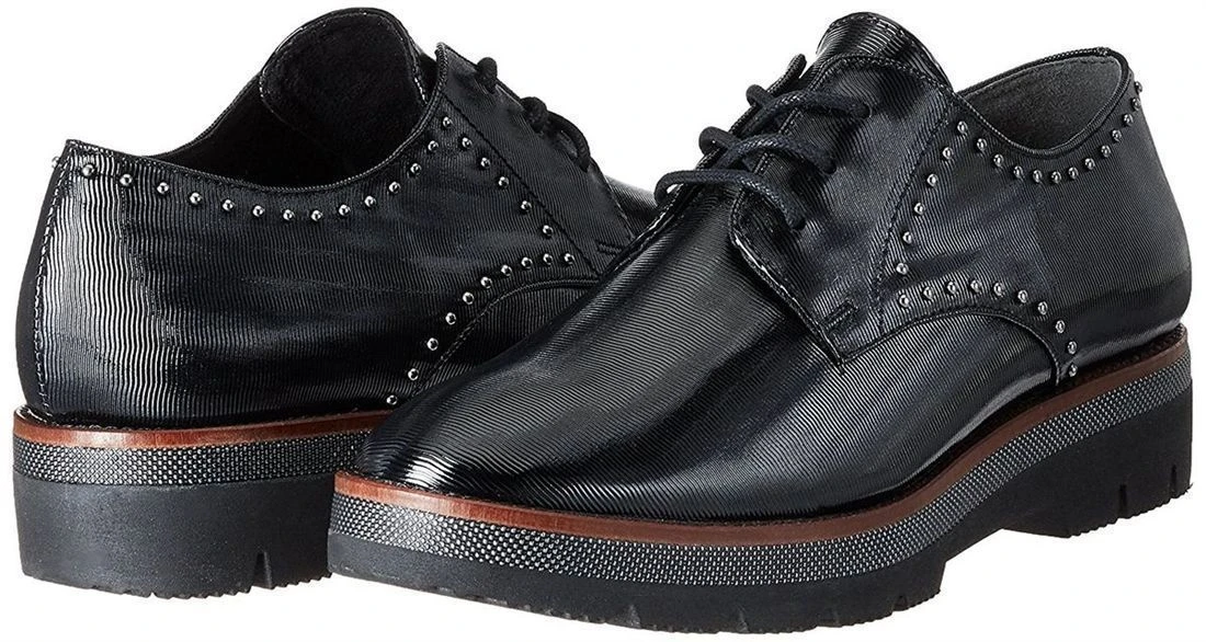 Derbies femme Marco Tozzi avec petit compensé.Mode, elles sont soulignées de petits clous et arborent une tige en synthétique texturé. Fermeture à lacets.Semelle avec compensé de 3.5 cm.Coloris : noir.