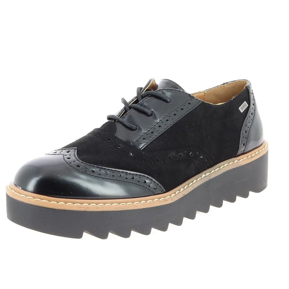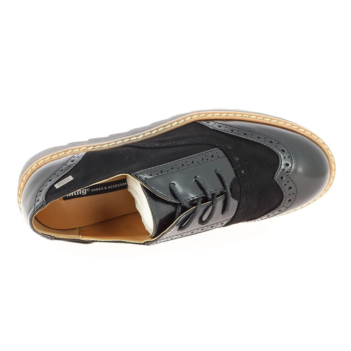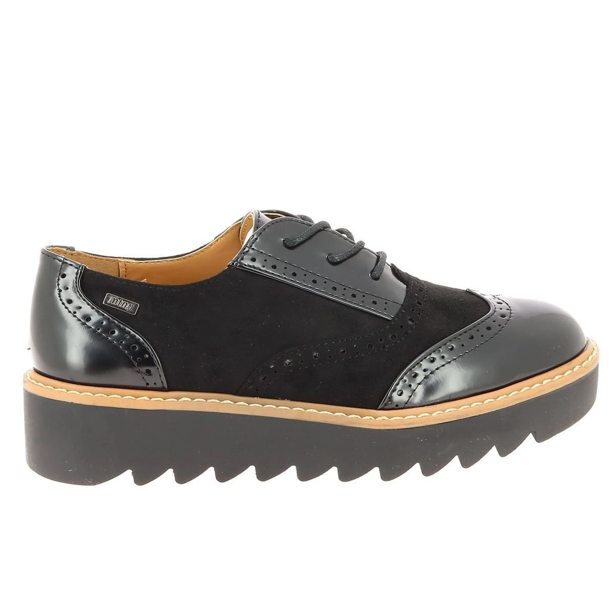Chaussures à lacets plateforme type derbies pour femme de la marque MTNG.Semelle : 4 cm. Dessus simili cuir bi-matières. Bout golf. Perforations esthétiques. Coloris : noir .