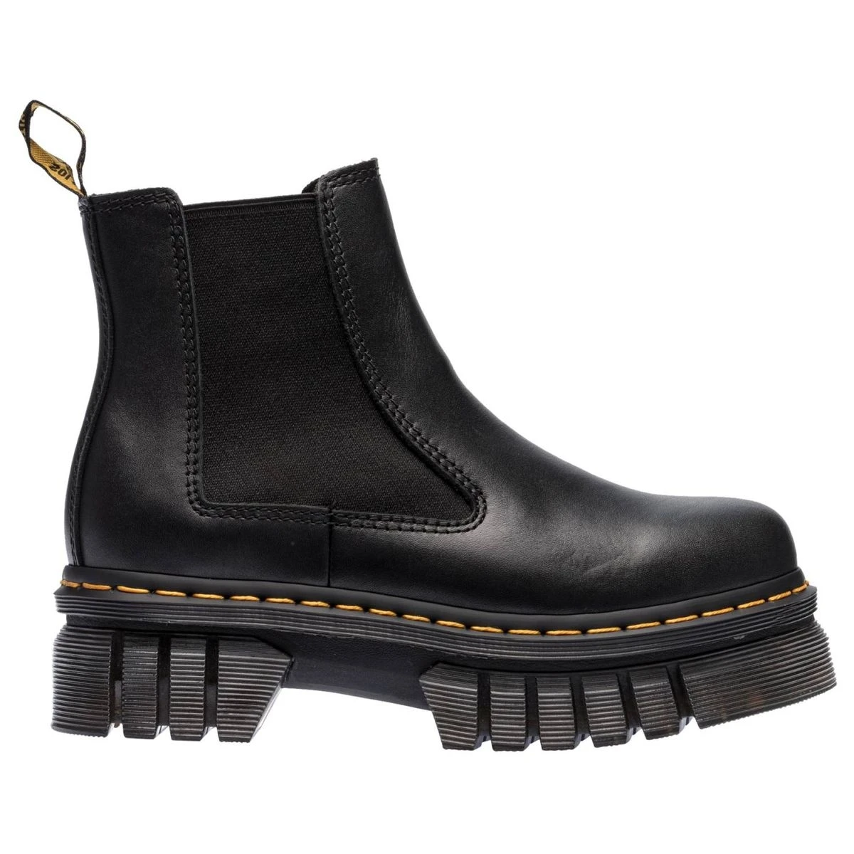 Ces bottines affichent tous les détails emblématiques de Dr Martens : semelle rainurée, surpiqûre jaune, languette au talon…