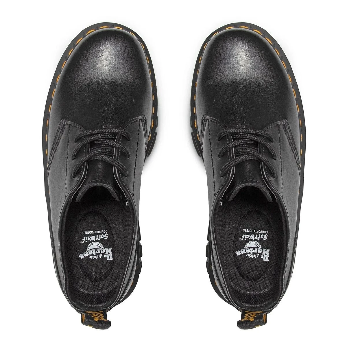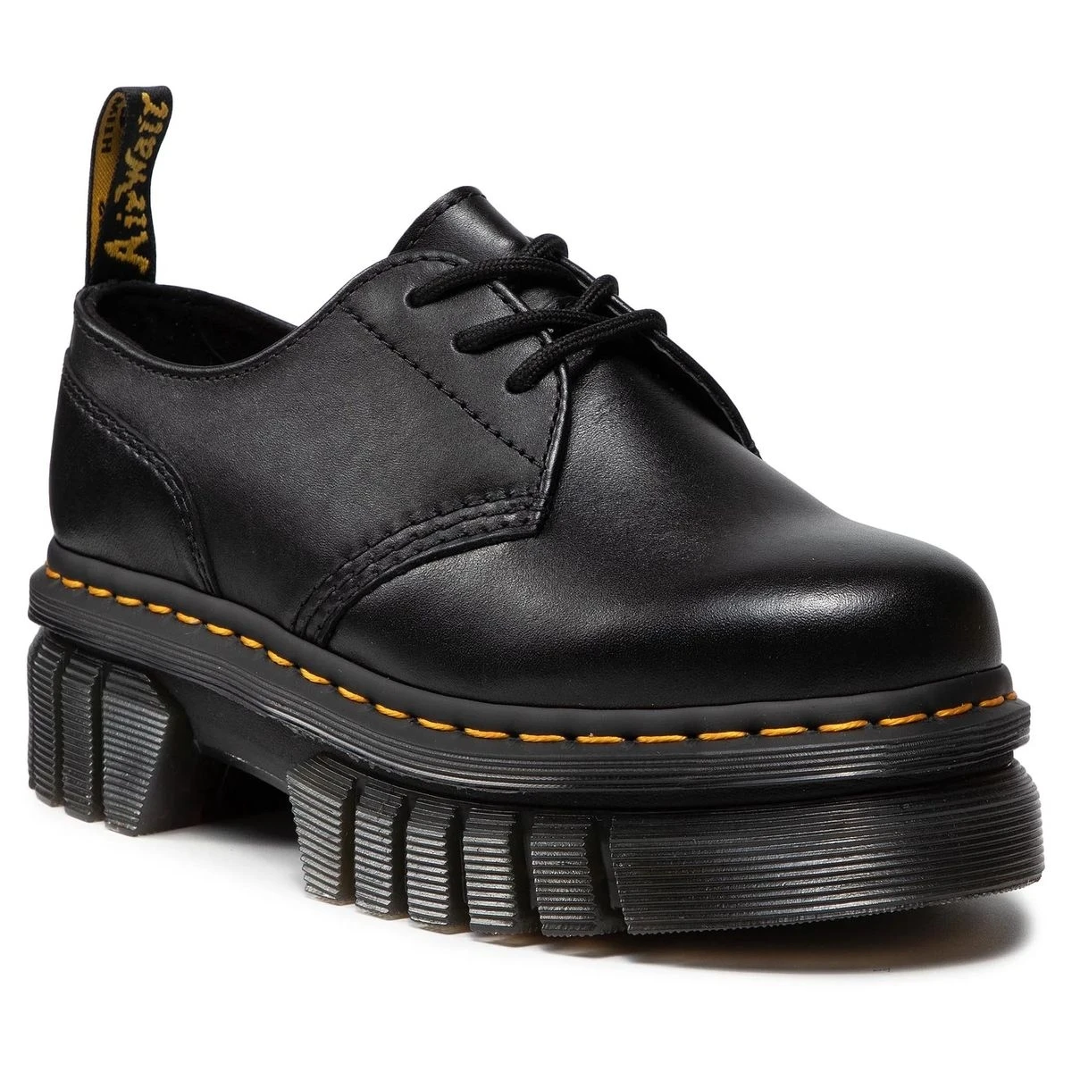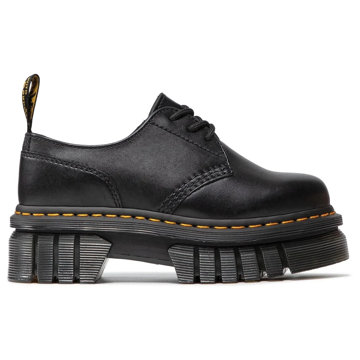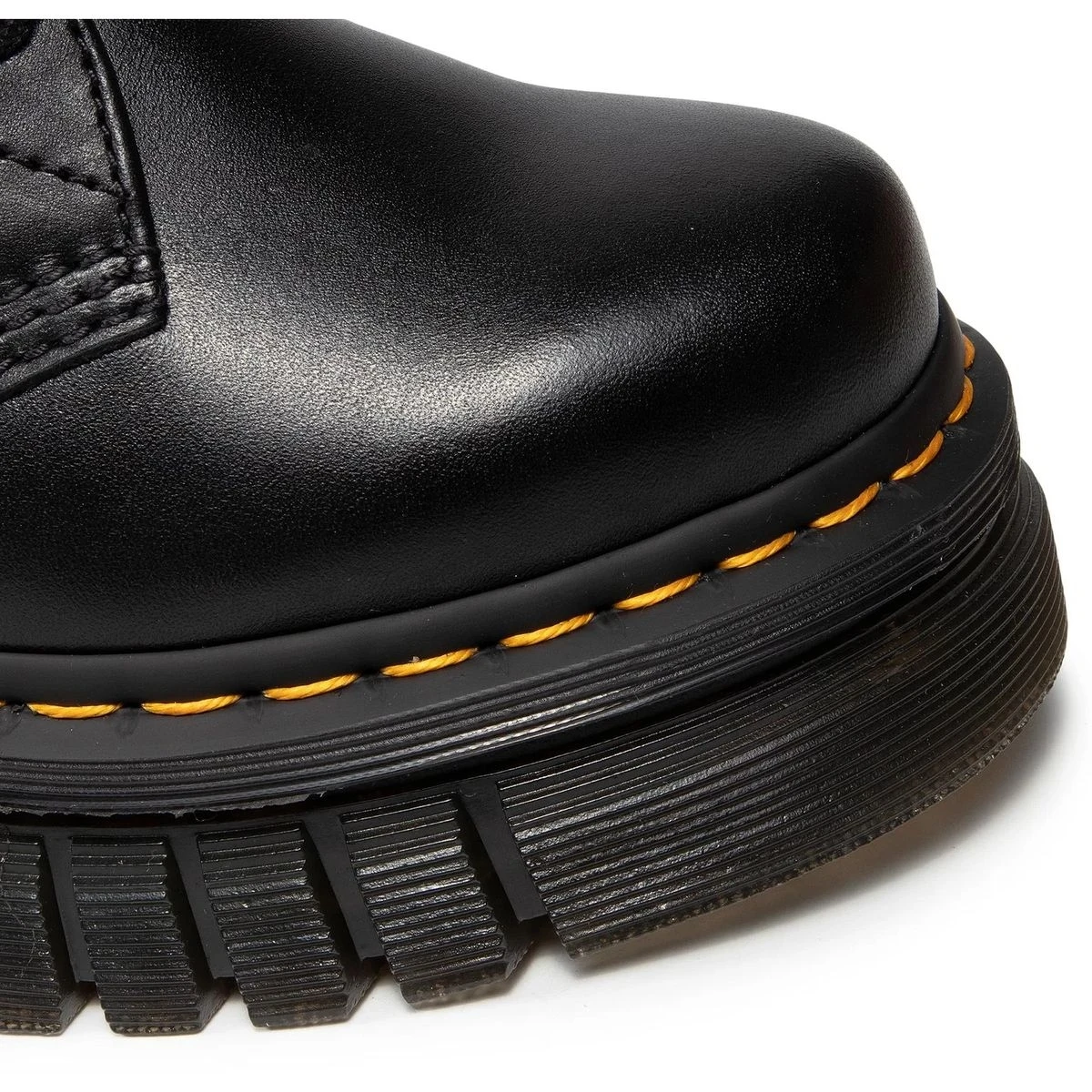 Ces chaussures affichent tous les détails emblématiques de Dr Martens : semelle rainurée, surpiqûre jaune, languette au talon…