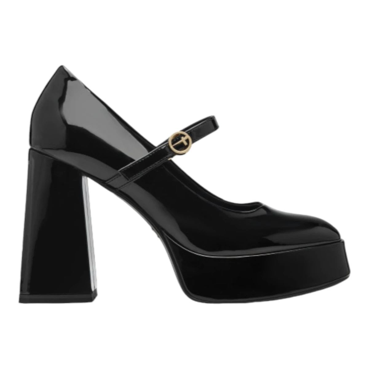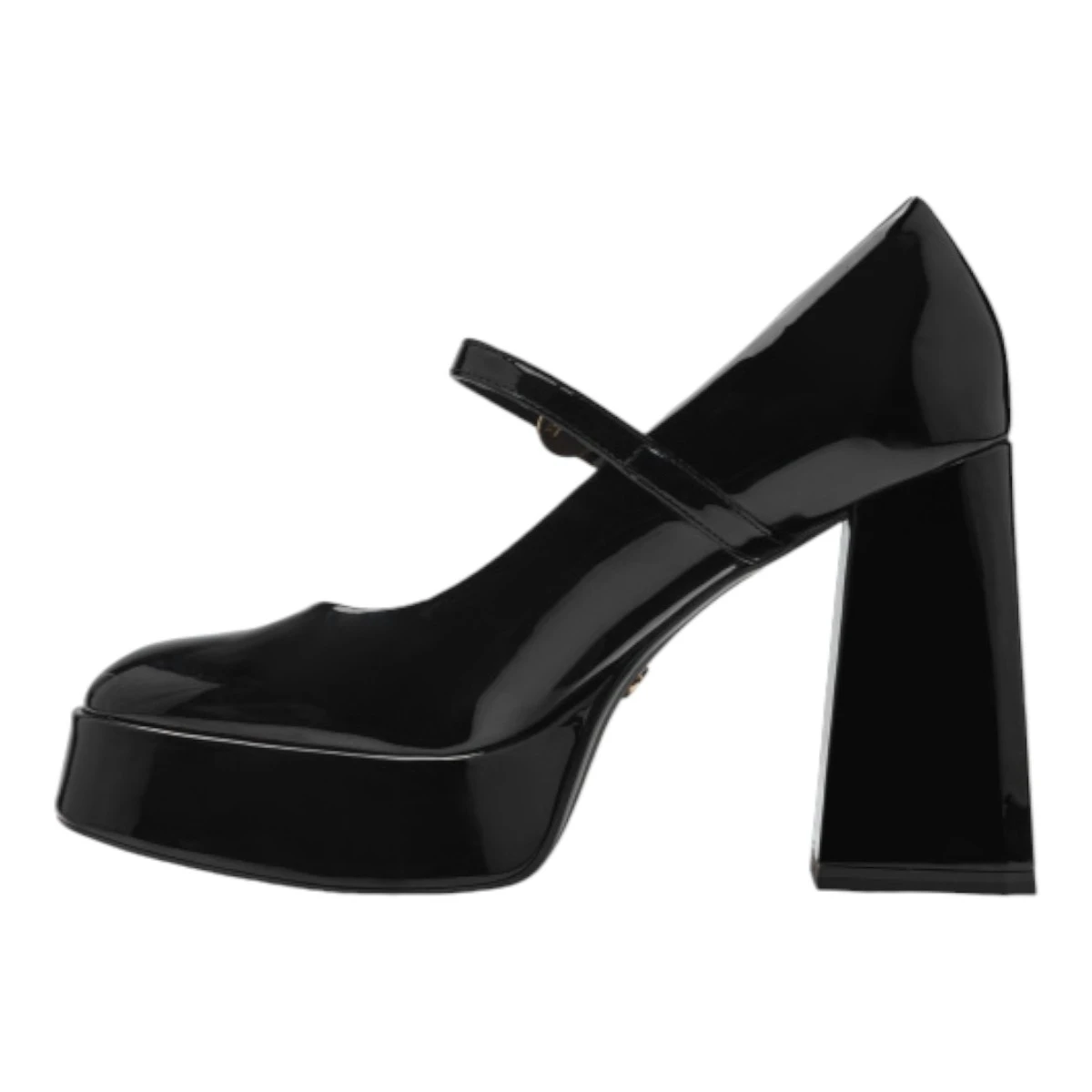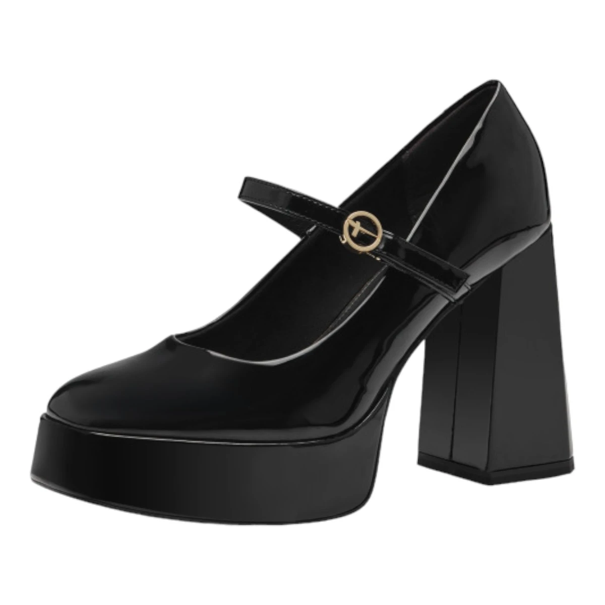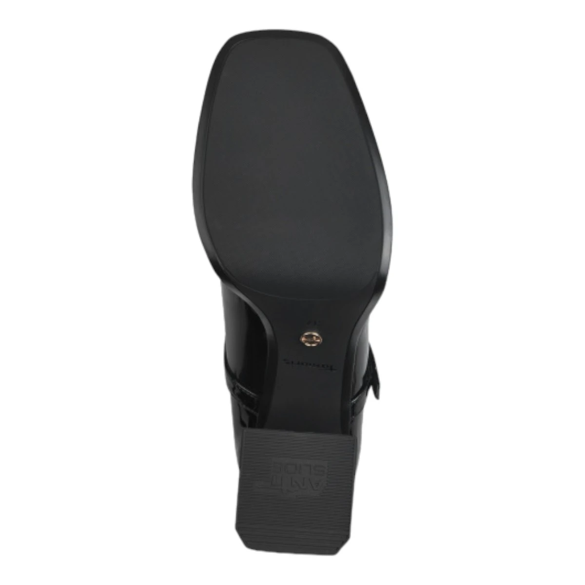Ces chaussures affichent un talon haut carré breveté, antichoc et antidérapant et une bride ajustable sur le devant.