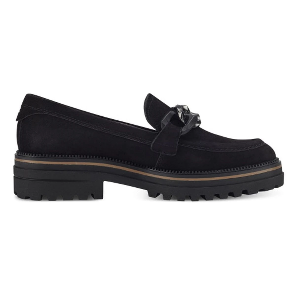 Optez pour cette version tendance du mocassin : un cuir suédé noir, une semelle épaisse et crantée et une chaine XXL en métal argenté.