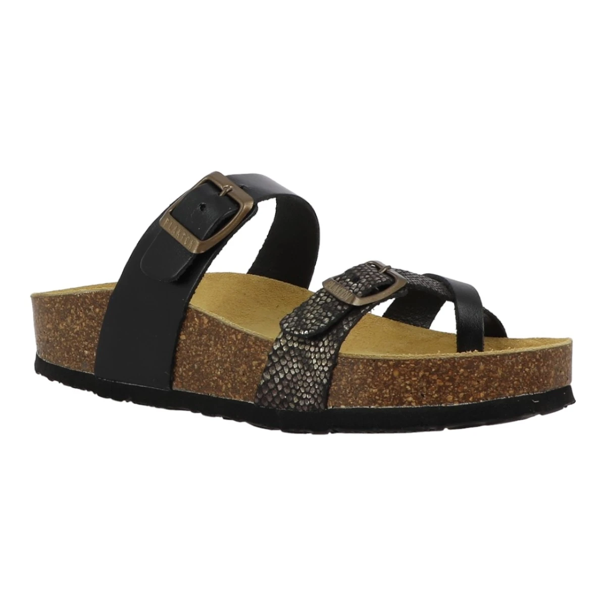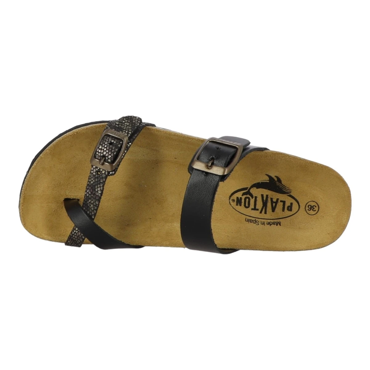 Retrouvez le plaisir de marcher grâce à ces mules anatomiques femme Bombay de marque Plakton couleur noir et or.Brides noires ornées de glitters.Bout rond. Semelle de propreté confortable en cuir.Doublure cuir. Semelle compensée en liège d’excellente qualité revêtue d’une couche en EVA antidérapante. .