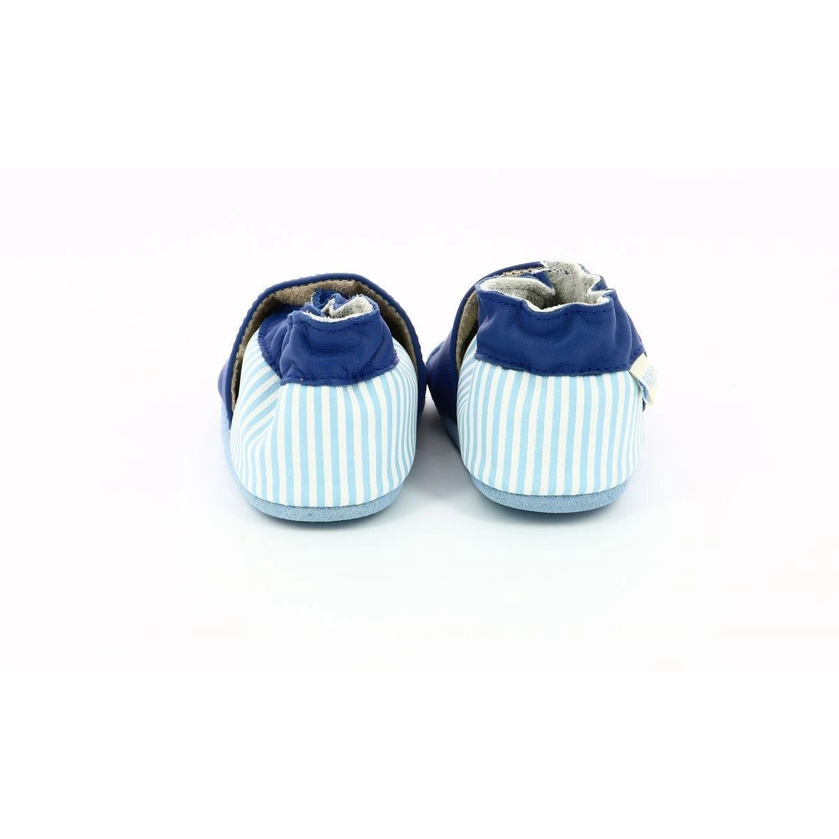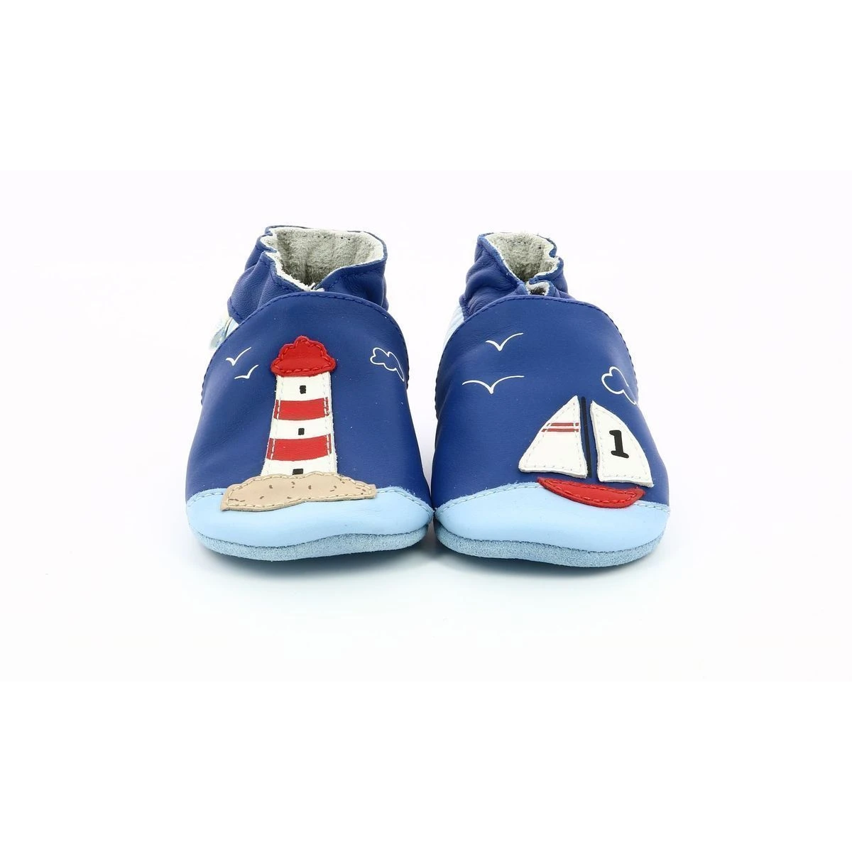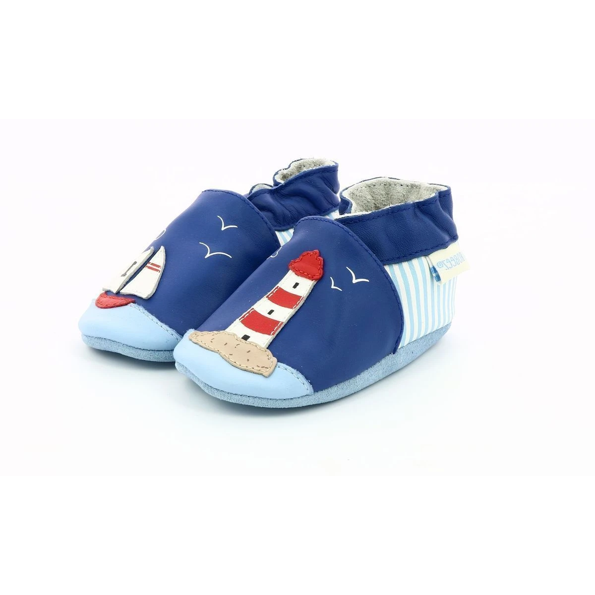 Chaussons bébé de la marque Robeez en cuir sur le thème de la mer.Les chaussons parfaits pour tous les jours qui restent toujours en place et enveloppent tendrement les petits pieds.- Semelle antidérapante en suède pour une utilisation en intérieur- Matériaux souples épousant chaque pas- Cuir français à tannage végétal.Chaussons de la naissance jusqu’à 6 ans.Bande cheville maintenant le chausson bien en place.Parfaits pour le pied du pied grâce à la semelle douce et légère.
