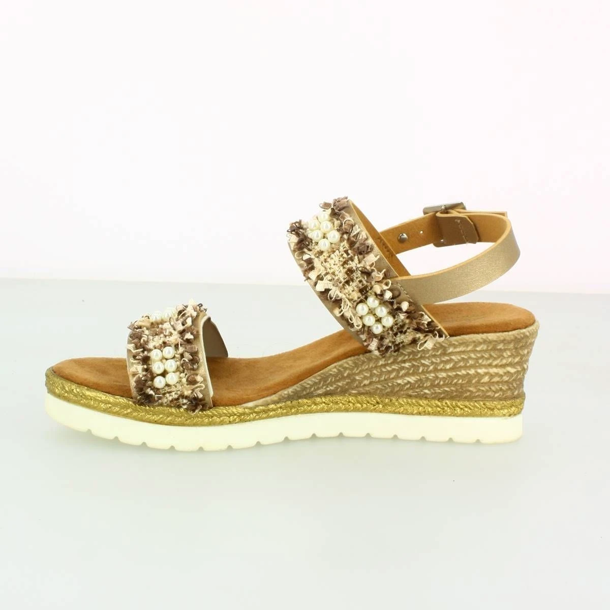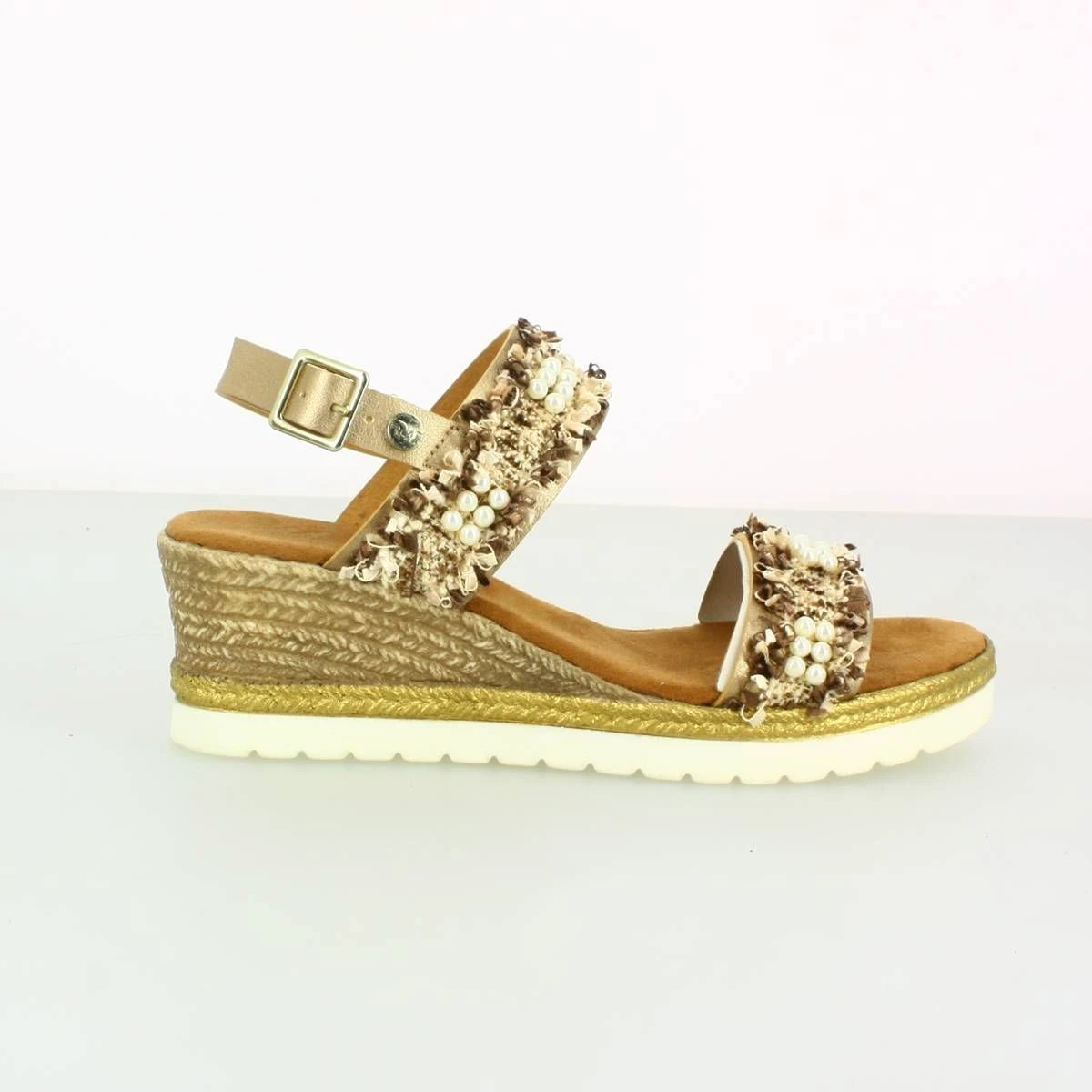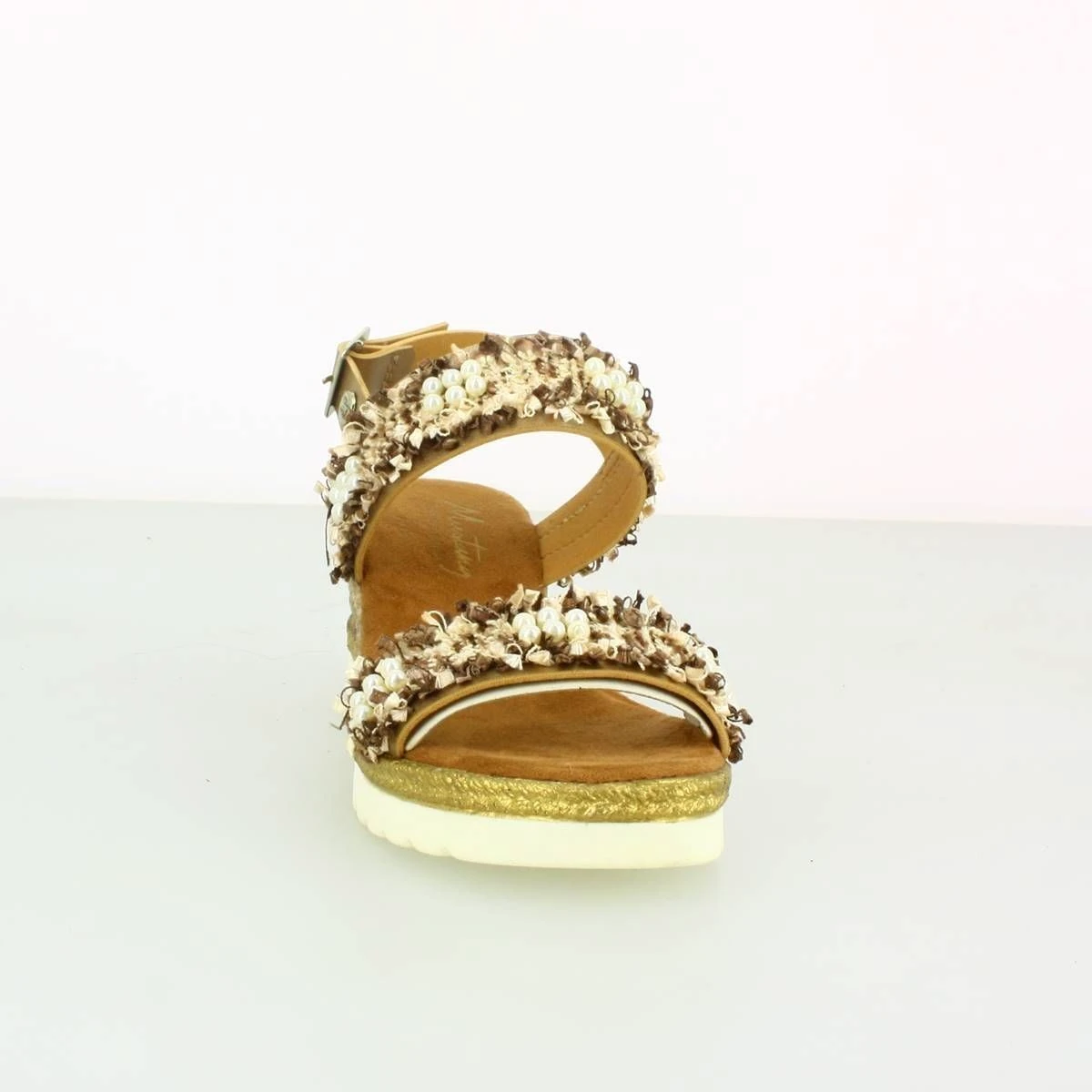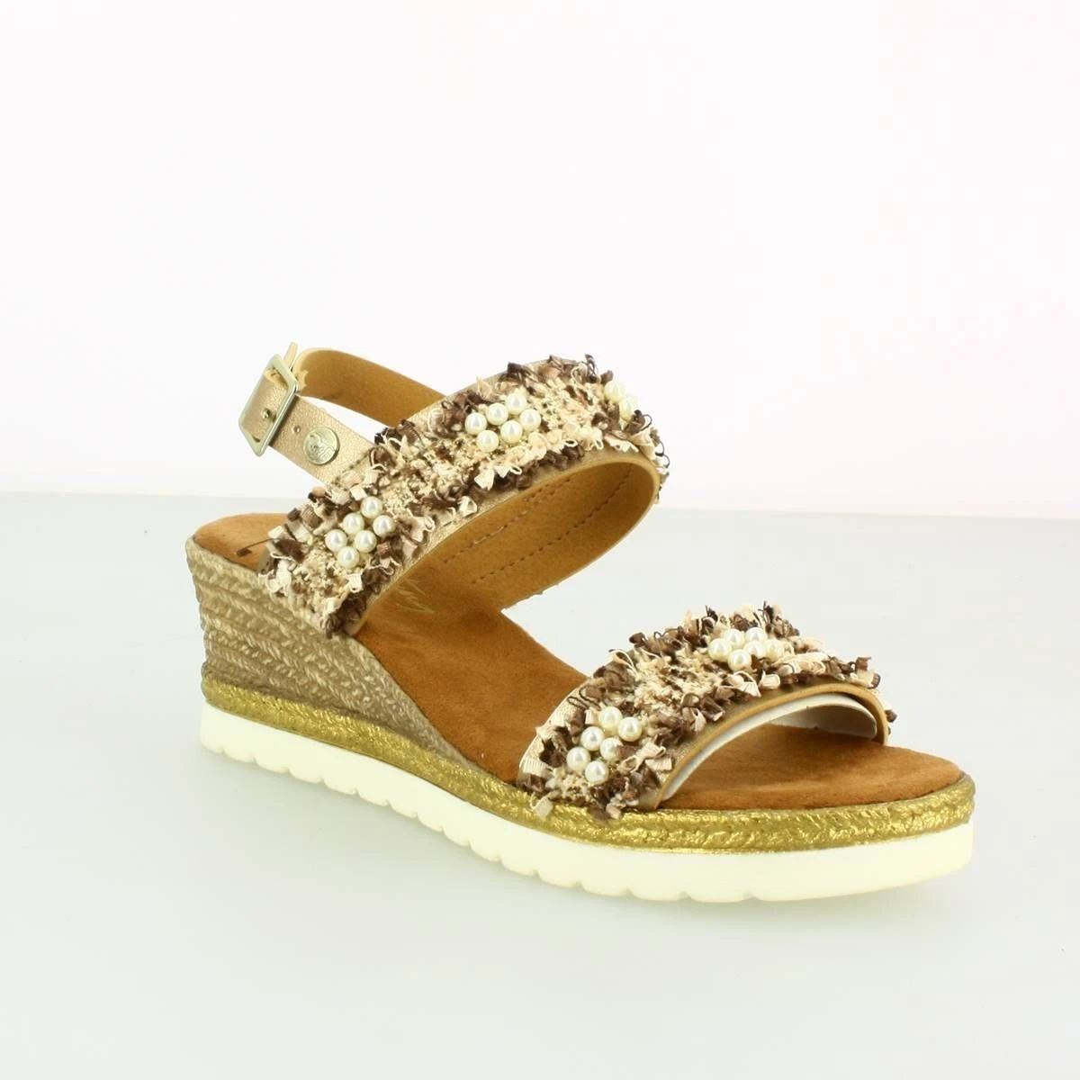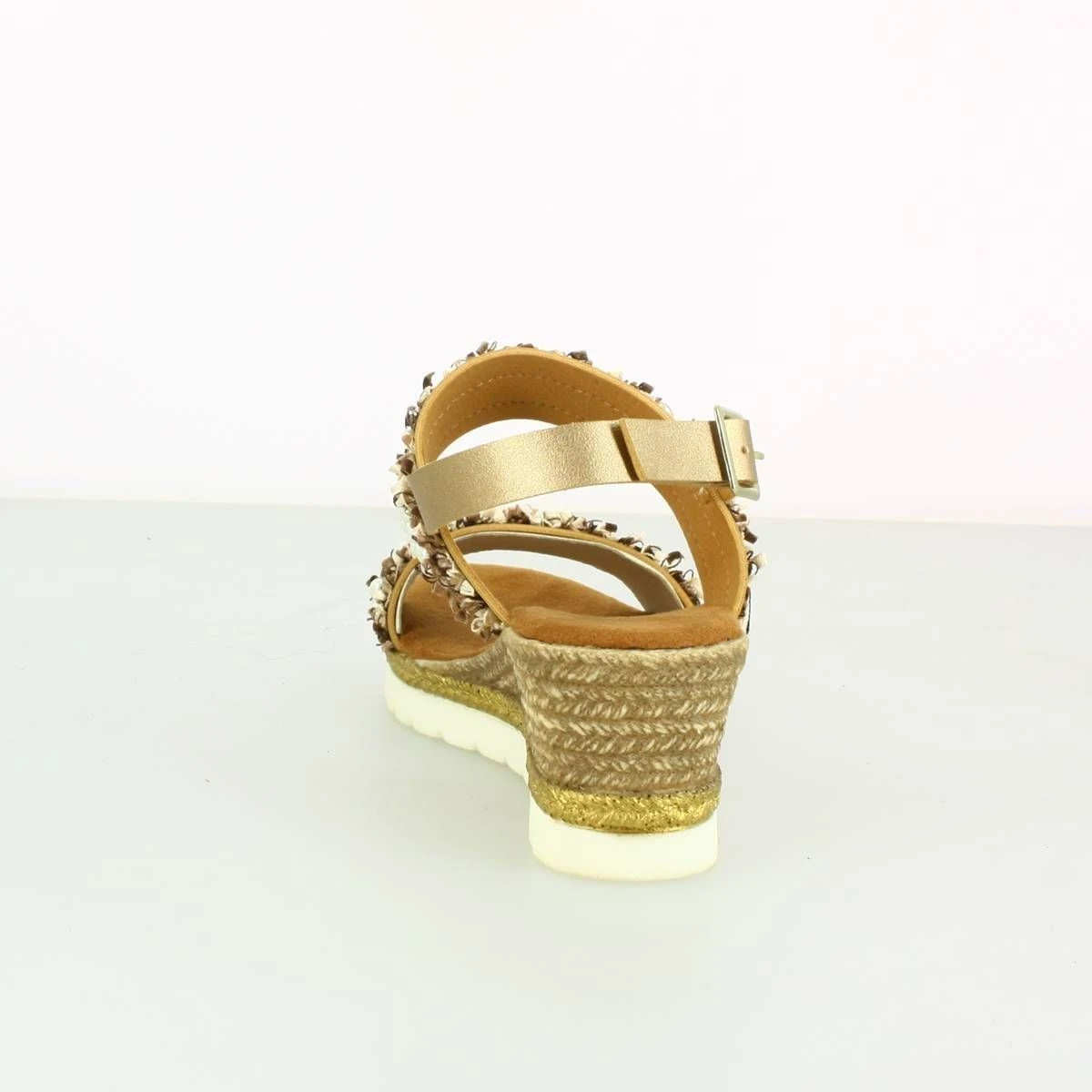 Sandales femme à talon compensé de la marque Mustang.Bride arrière à boucle. Coloris : doré.