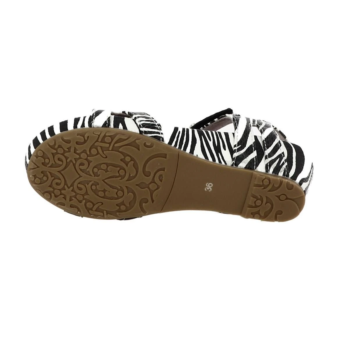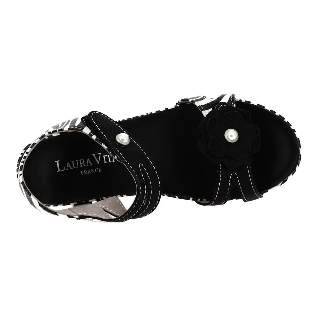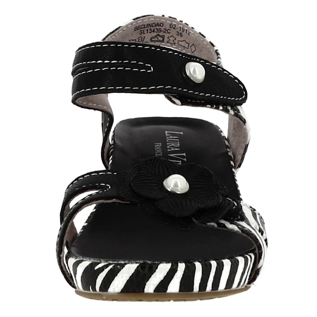 Sandales compensées pour femme Laura Vita modèle Beclindao 02.Tige en cuir zébré noir et blanc. Doublure et première cuir.Semelle extérieure en gomme. Fermeture par scratch.Hauteur de talon : 5 cm.Coloris : blanc/noir.