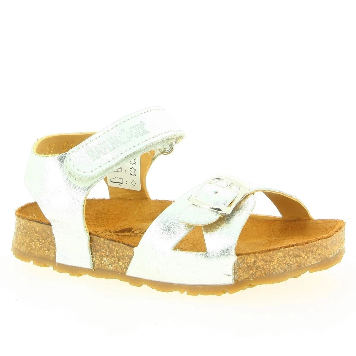 Sandales fille Haflinger Bio modèle Fritzi en cuir argenté.Fermeture par bride à boucle et ajustement par velcro à la cheville.Les pieds reposent sur une semelle de forme anatomique en liège. Semelle extérieure antidérapante en gomme.Coloris : silver.