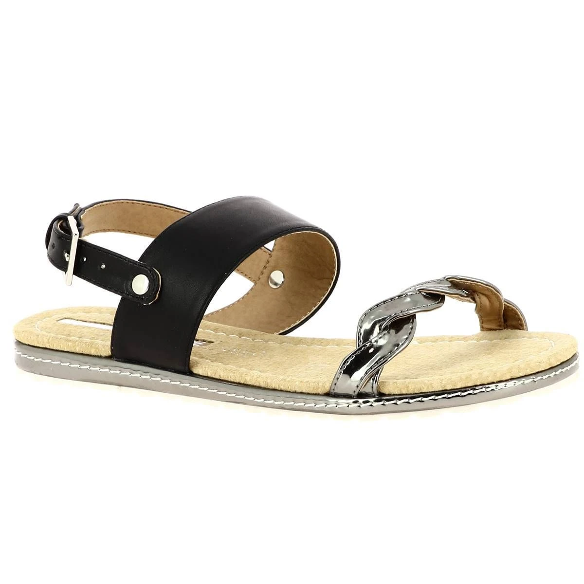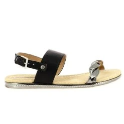 Sandales nus-pieds Mariamare pour femme modèle Alia aux finitions argentées. Chics et glamour, ces nus pieds légers sont soulignés par une bande argentée sur la semelle et arbore une bride tressée à l’avant dans les tons silver. On aime sa ligne légère et grâcieuse. Dessus simili cuir. Première de propreté en cuir. Semelle synthétique. Coloris : noir/silver.