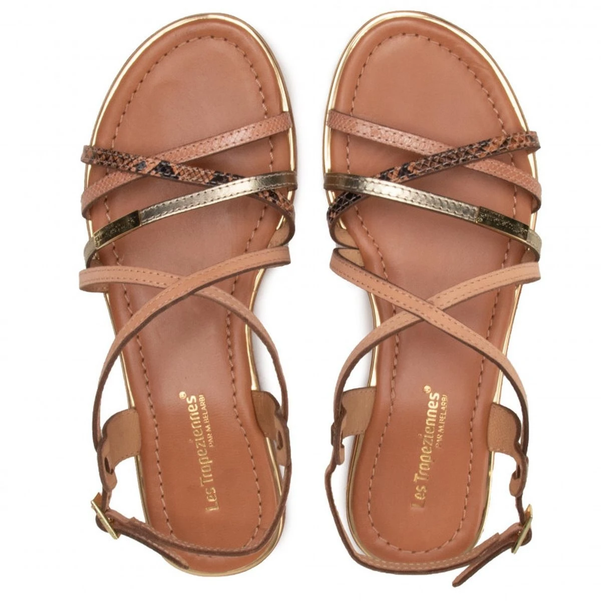 Sandale femme de la marque Les TropĂ©ziennes by M. Belarbi modèle Harry. Munie d’un liserĂ© dorĂ© autour de la semelle et d’une boucle ajustable. Lanières croisĂ©es.Dessus, doublure et première cuir.